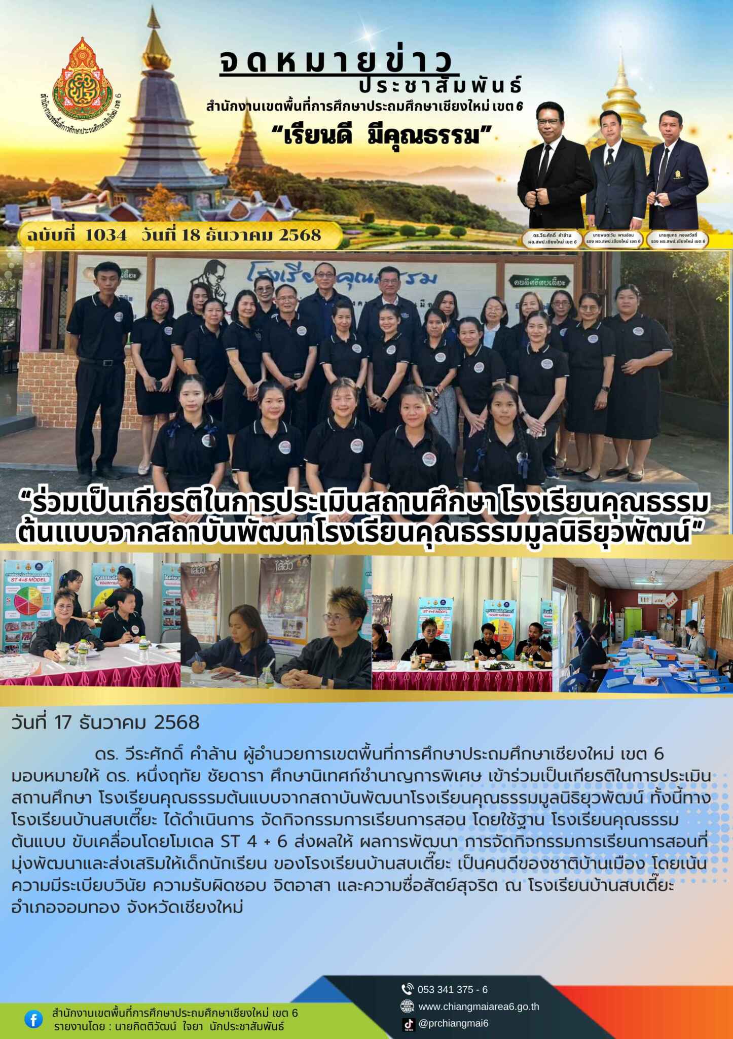 วันที่ 17 ธันวาคม 2568 ดร. วีระศักดิ์ คำล้าน ผู้อำนวยการเขตพื้นที่การศึกษาประถมศึกษาเชียงใหม่ เขต 6 มอบหมายให้ ดร. หนึ่งฤทัย ชัยดารา ศึกษานิเทศก์ชำนาญการพิเศษ เข้าร่วมเป็นเกียรติในการประเมินสถานศึกษา โรงเรียนคุณธรรมต้นแบบจากสถาบันพัฒนาโรงเรียนคุณธรรมมูลนิธิยุวพัฒน์ ทั้งนี้ทางโรงเรียนบ้านสบเตี๊ยะ ได้ดำเนินการ จัดกิจกรรมการเรียนการสอน โดยใช้ฐาน โรงเรียนคุณธรรมต้นแบบ ขับเคลื่อนโดยโมเดล ST 4 + 6 ส่งผลให้ ผลการพัฒนา การจัดกิจกรรมการเรียนการสอนที่มุ่งพัฒนาและส่งเสริมให้เด็กนักเรียน ของโรงเรียนบ้านสบเตี๊ยะ เป็นคนดีของชาติบ้านเมือง โดยเน้นความมีระเบียบวินัย ความรับผิดชอบ จิตอาสา และความซื่อสัตย์สุจริต ณ โรงเรียนบ้านสบเตี๊ยะ อำเภอจอมทอง จังหวัดเชียงใหม่