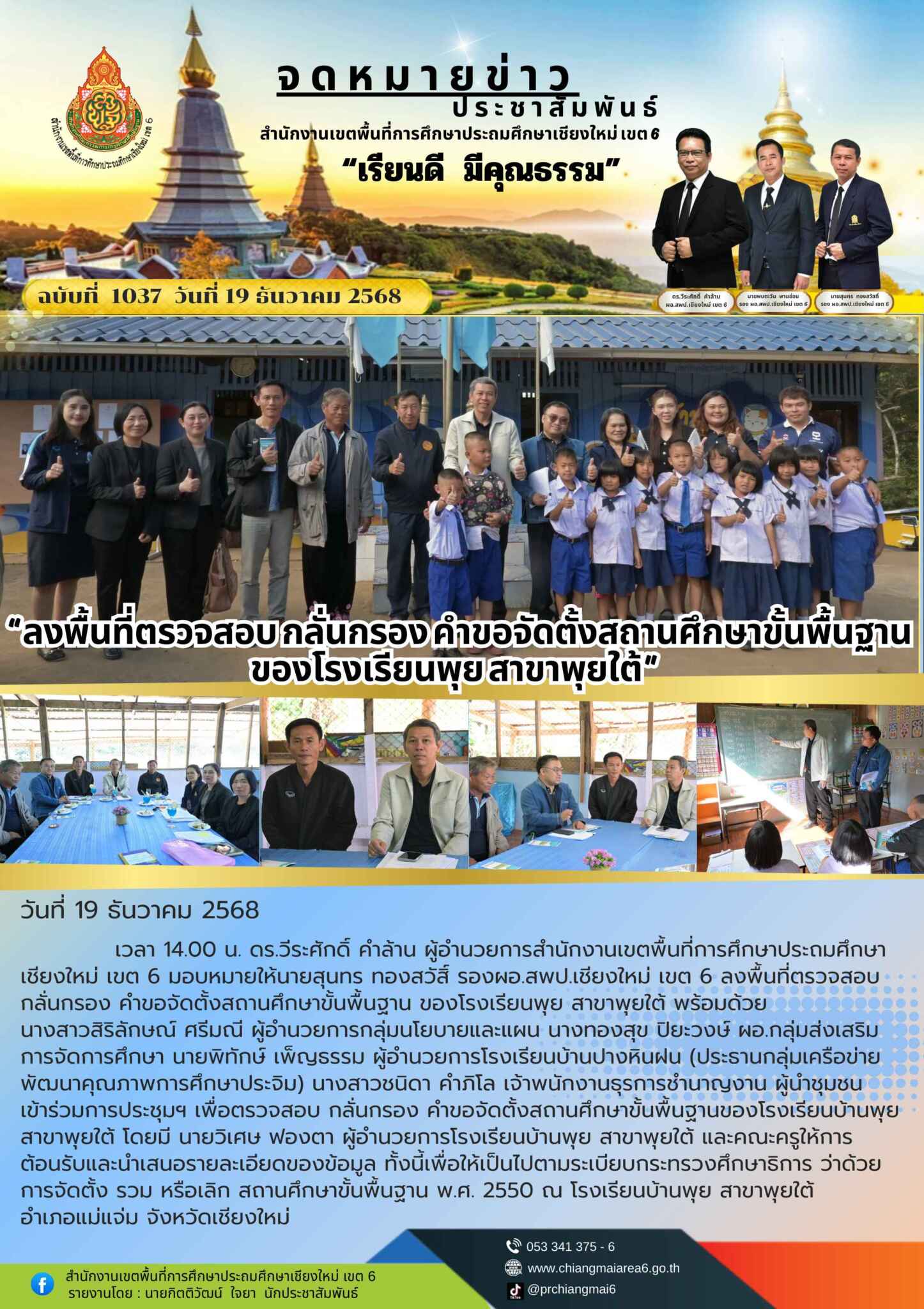 วันที่ 19 ธันวาคม 2568 เวลา 14.00 น. ดร.วีระศักดิ์ คำล้าน ผู้อำนวยการสำนักงานเขตพื้นที่การศึกษาประถมศึกษาเชียงใหม่ เขต 6 มอบหมายให้นายสุนทร ทองสวัสิ์ รองผอ.สพป.เชียงใหม่ เขต 6 ลงพื้นที่ตรวจสอบ กลั่นกรอง คำขอจัดตั้งสถานศึกษาขั้นพื้นฐาน ของโรงเรียนพุย สาขาพุยใต้ พร้อมด้วย นางสาวสิริลักษณ์ ศรีมณี ผู้อำนวยการกลุ่มนโยบายและแผน นางทองสุข ปิยะวงษ์ ผอ.กลุ่มส่งเสริมการจัดการศึกษา นายพิทักษ์ เพ็ญธรรม ผู้อำนวยการโรงเรียนบ้านปางหินฝน (ประธานกลุ่มเครือข่ายพัฒนาคุณภาพการศึกษาประจิม) นางสาวชนิดา คำภิโล เจ้าพนักงานธุรการชำนาญงาน ผู้นำชุมชน เข้าร่วมการประชุมฯ เพื่อตรวจสอบ กลั่นกรอง คำขอจัดตั้งสถานศึกษาขั้นพื้นฐานของโรงเรียนบ้านพุย สาขาพุยใต้ โดยมี นายวิเศษ ฟองตา ผู้อำนวยการโรงเรียนบ้านพุย สาขาพุยใต้ และคณะครูให้การต้อนรับและนำเสนอรายละเอียดของข้อมูล ทั้งนี้เพื่อให้เป็นไปตามระเบียบกระทรวงศึกษาธิการ ว่าด้วยการจัดตั้ง รวม หรือเลิก สถานศึกษาขั้นพื้นฐาน พ.ศ. 2550 ณ โรงเรียนบ้านพุย สาขาพุยใต้ อำเภอแม่แจ่ม จังหวัดเชียงใหม่
