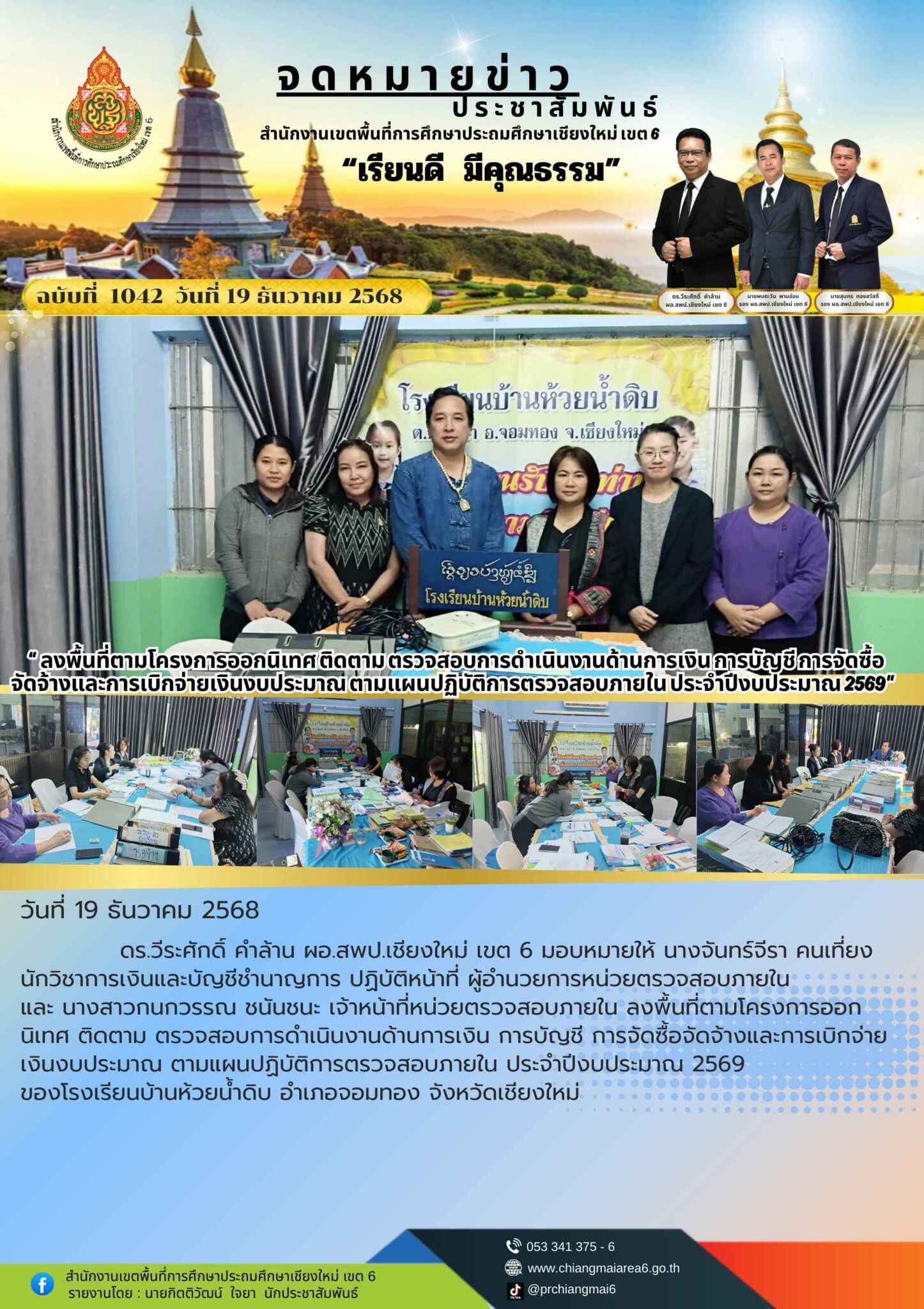 วันที่ 19 ธันวาคม 2568 ดร.วีระศักดิ์ คำล้าน ผอ.สพป.เชียงใหม่ เขต 6 มอบหมายให้ นางจันทร์จีรา คนเที่ยง นักวิชาการเงินและบัญชีชำนาญการ ปฏิบัติหน้าที่ ผู้อำนวยการหน่วยตรวจสอบภายใน และ นางสาวกนกวรรณ ชนันชนะ เจ้าหน้าที่หน่วยตรวจสอบภายใน ลงพื้นที่ตามโครงการออกนิเทศ ติดตาม ตรวจสอบการดำเนินงานด้านการเงิน การบัญชี การจัดซื้อจัดจ้างและการเบิกจ่ายเงินงบประมาณ ตามแผนปฏิบัติการตรวจสอบภายใน ประจำปีงบประมาณ 2569 ของโรงเรียนบ้านห้วยน้ำดิบ อำเภอจอมทอง จังหวัดเชียงใหม่
