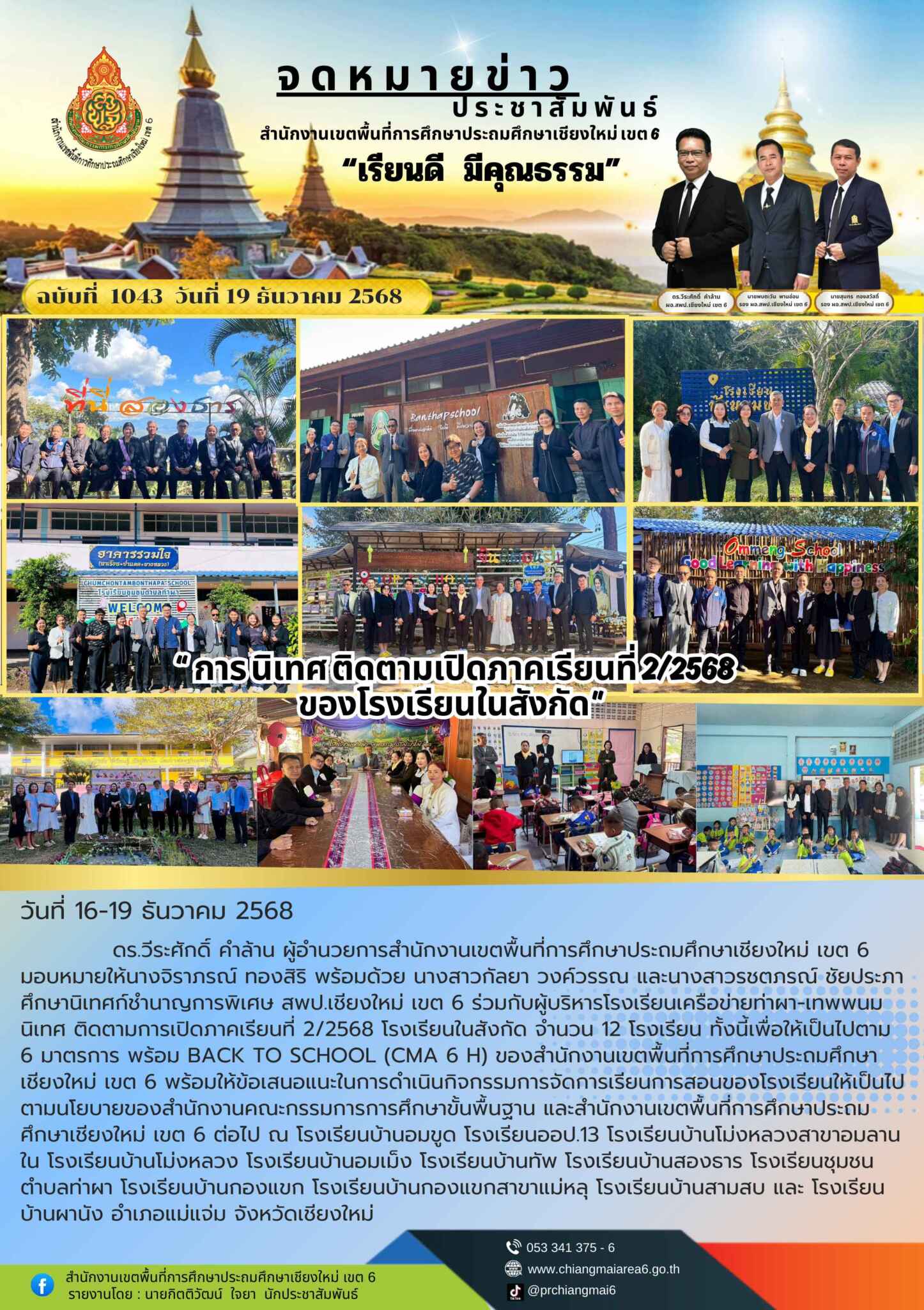 “สวันที่ 16-19 ธันวาคม 2568 ดร.วีระศักดิ์ คำล้าน ผู้อำนวยการสำนักงานเขตพื้นที่การศึกษาประถมศึกษาเชียงใหม่ เขต 6 มอบหมายให้นางจิราภรณ์ ทองสิริ พร้อมด้วย นางสาวกัลยา วงค์วรรณ และนางสาวรชตภรณ์ ชัยประภา ศึกษานิเทศก์ชำนาญการพิเศษ สพป.เชียงใหม่ เขต 6 ร่วมกับผู้บริหารโรงเรียนเครือข่ายท่าผา-เทพพนม นิเทศ ติดตามการเปิดภาคเรียนที่ 2/2568 โรงเรียนในสังกัด จำนวน 12 โรงเรียน ทั้งนี้เพื่อให้เป็นไปตาม 6 มาตรการ พร้อม BACK TO SCHOOL (CMA 6 H) ของสำนักงานเขตพื้นที่การศึกษาประถมศึกษาเชียงใหม่ เขต 6 พร้อมให้ข้อเสนอแนะในการดำเนินกิจกรรมการจัดการเรียนการสอนของโรงเรียนให้เป็นไปตามนโยบายของสำนักงานคณะกรรมการการศึกษาขั้นพื้นฐาน และสำนักงานเขตพื้นที่การศึกษาประถมศึกษาเชียงใหม่ เขต 6 ต่อไป ณ โรงเรียนบ้านอมขูด โรงเรียนออป.13 โรงเรียนบ้านโม่งหลวงสาขาอมลานใน โรงเรียนบ้านโม่งหลวง โรงเรียนบ้านอมเม็ง โรงเรียนบ้านทัพ โรงเรียนบ้านสองธาร โรงเรียนชุมชนตำบลท่าผา โรงเรียนบ้านกองแขก โรงเรียนบ้านกองแขกสาขาแม่หลุ โรงเรียนบ้านสามสบ และ โรงเรียนบ้านผานัง อำเภอแม่แจ่ม จังหวัดเชียงใหม่