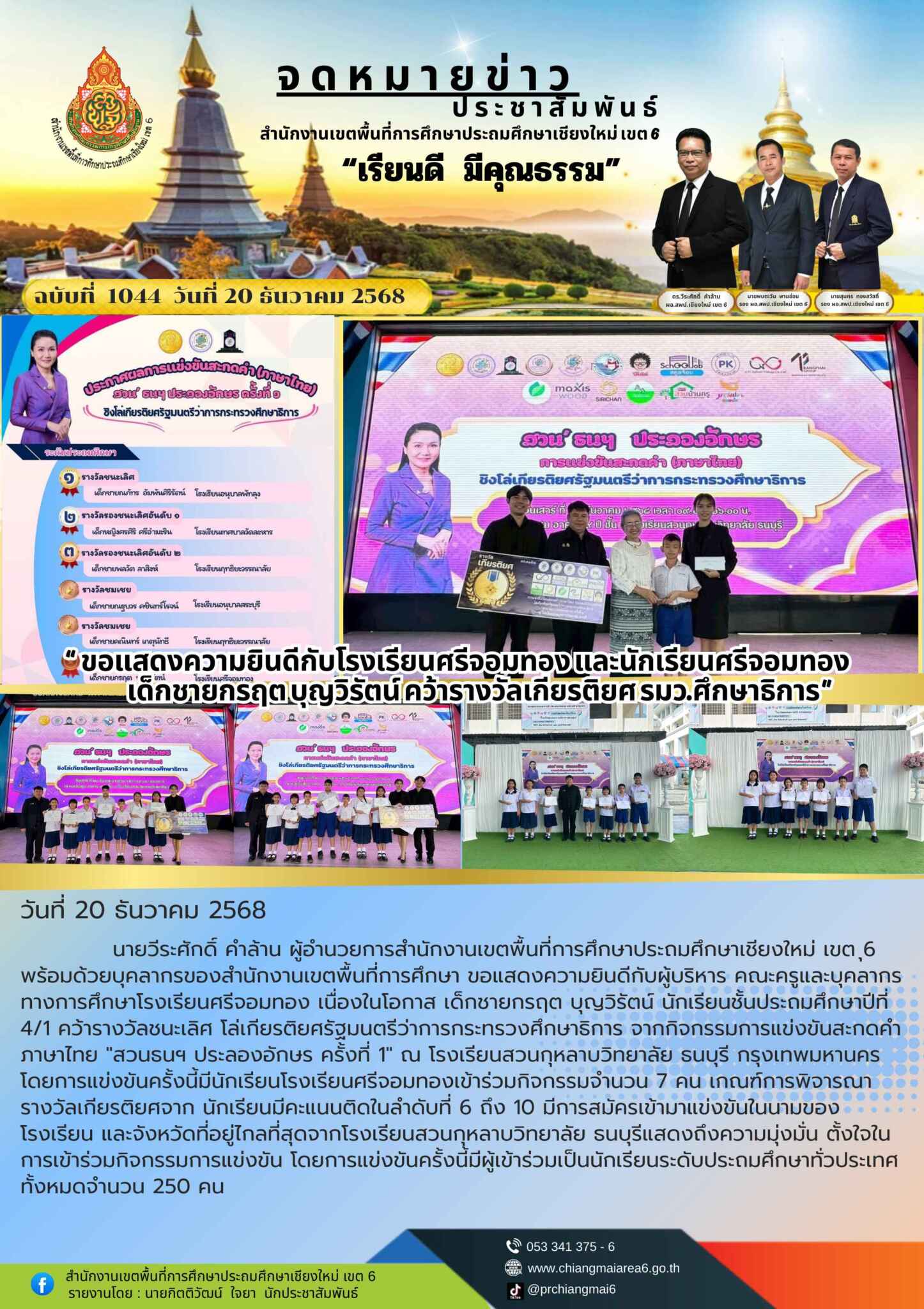 นายวีระศักดิ์ คำล้าน ผู้อำนวยการสำนักงานเขตพื้นที่การศึกษาประถมศึกษาเชียงใหม่ เขต ๖ พร้อมด้วยบุคลากรของสำนักงานเขตพื้นที่การศึกษา ขอแสดงความยินดีกับผู้บริหาร คณะครูและบุคลากรทางการศึกษาโรงเรียนศรีจอมทอง เนื่องในโอกาส เด็กชายกรฤต บุญวิรัตน์ นักเรียนชั้นประถมศึกษาปีที่ 4/1 คว้ารางวัลชนะเลิศ โล่เกียรติยศรัฐมนตรีว่าการกระทรวงศึกษาธิการ จากกิจกรรมการแข่งขันสะกดคำภาษาไทย “สวนธนฯ ประลองอักษร ครั้งที่ 1” ณ โรงเรียนสวนกุหลาบวิทยาลัย ธนบุรี กรุงเทพมหานคร โดยการแข่งขันครั้งนี้มีนักเรียนโรงเรียนศรีจอมทองเข้าร่วมกิจกรรมจำนวน 7 คน เกณฑ์การพิจารณารางวัลเกียรติยศจาก นักเรียนมีคะแนนติดในลำดับที่ 6 ถึง 10 มีการสมัครเข้ามาแข่งขันในนามของโรงเรียน และจังหวัดที่อยู่ไกลที่สุดจากโรงเรียนสวนกุหลาบวิทยาลัย ธนบุรีแสดงถึงความมุ่งมั่น ตั้งใจในการเข้าร่วมกิจกรรมการแข่งขัน โดยการแข่งขันครั้งนี้มีผู้เข้าร่วมเป็นนักเรียนระดับประถมศึกษาทั่วประเทศ ทั้งหมดจำนวน 250 คน