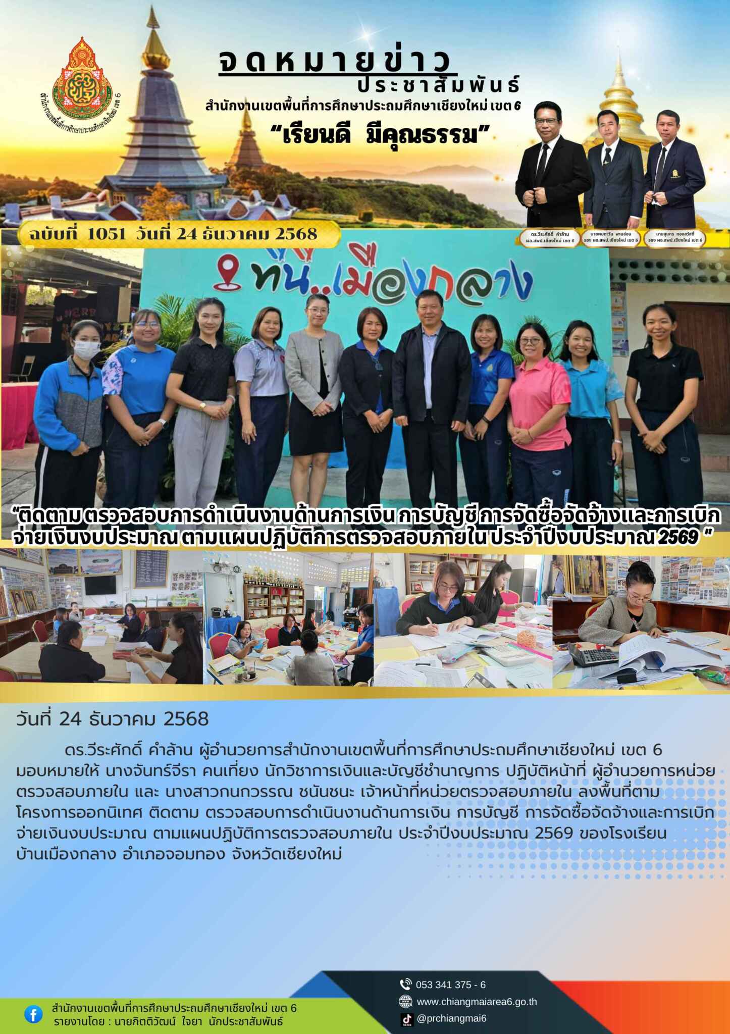 วันที่ 24 ธันวาคม 2568 ดร.วีระศักดิ์ คำล้าน ผู้อำนวยการสำนักงานเขตพื้นที่การศึกษาประถมศึกษาเชียงใหม่ เขต 6 มอบหมายให้ นางจันทร์จีรา คนเที่ยง นักวิชาการเงินและบัญชีชำนาญการ ปฏิบัติหน้าที่ ผู้อำนวยการหน่วยตรวจสอบภายใน และ นางสาวกนกวรรณ ชนันชนะ เจ้าหน้าที่หน่วยตรวจสอบภายใน ลงพื้นที่ตามโครงการออกนิเทศ ติดตาม ตรวจสอบการดำเนินงานด้านการเงิน การบัญชี การจัดซื้อจัดจ้างและการเบิกจ่ายเงินงบประมาณ ตามแผนปฏิบัติการตรวจสอบภายใน ประจำปีงบประมาณ 2569 ของโรงเรียนบ้านเมืองกลาง อำเภอจอมทอง จังหวัดเชียงใหม่