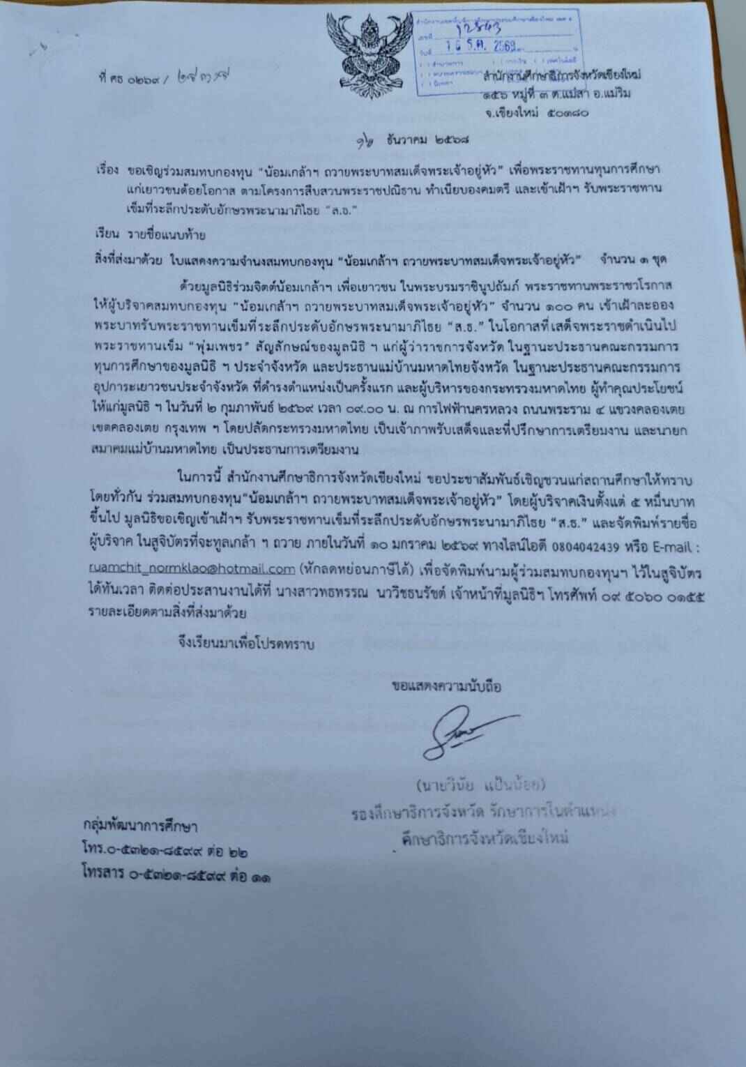 ข่าวประชาสัมพันธ์ “ประชาสัมพันธ์ ขอเชิญร่วมสมทบกองทุน น้อมเกล้าฯ ถวายพระบาทสมเด็จพระเจ้าอยู่หัว” เพื่อพระราชทานทุนการศึกษาแก่เยาวชนด้อยโอกาส ตามโครงการสืบสวนพระราชปณิธาน” กิตติวัฒน์ ใจยา ธันวาคม 26, 2025 1 minute read 28318Download Post navigation Previous: “ประชาสัมพันธ์เชิญชวนเข้าร่วมกิจกรรมและเยี่ยมชมงาน “วันนักประดิษฐ์” ประจำปี 2569″Next: “ประชาสัมพันธ์ ประกาศคณะกรรมการคุรุสภา เรื่องรายละเอียดของมาตรฐานความรู้และประสบการณ์วิชาชีพครูปฐมวัย พ.ศ. 2568” Related Stories ข่าวประชาสัมพันธ์ “ประชาสัมพันธ์ การประกวดออกแบบโล่และตราสัญลักษณ์การบริหารจัดการเรื่องร้องทุกข์โดดเด่น” กิตติวัฒน์ ใจยา มีนาคม 20, 2026 ข่าวประชาสัมพันธ์ “ประชาสัมพันธ์การถวายบังคมพระบรมศพสมเด็จพระนางเจ้าสิริกิติ์ พระบรมราชินีนาถ พระบรมราชชนนีพันปีหลวง” กิตติวัฒน์ ใจยา มีนาคม 20, 2026 ข่าวประชาสัมพันธ์ “ประชาสัมพันธ์การแข่งขันทักษะทางไซเบอร์ NCSA AL CTF 2026” กิตติวัฒน์ ใจยา มีนาคม 16, 2026