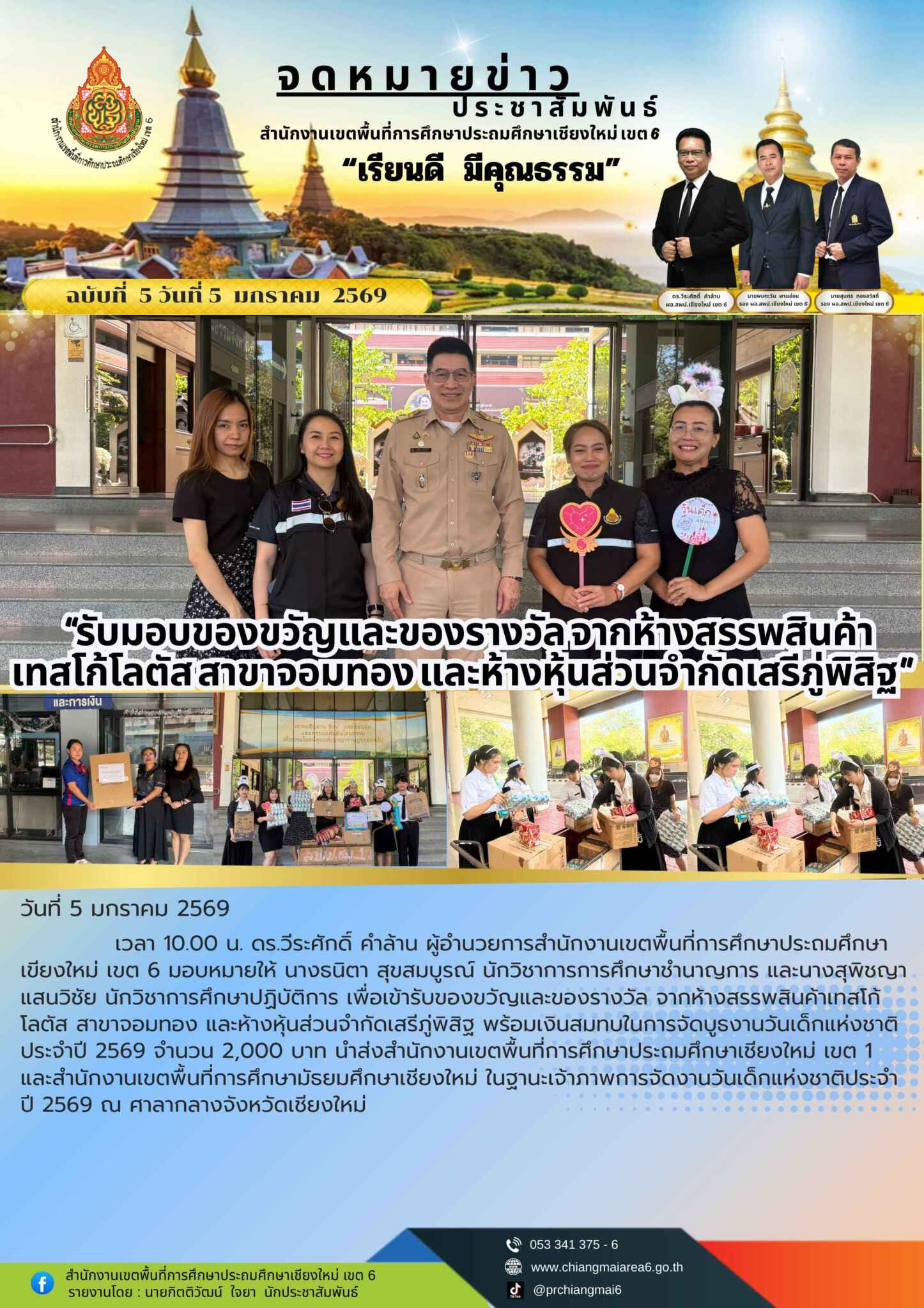 วันที่ 5 มกราคม 2569 เวลา 10.00 น. ดร.วีระศักดิ์ คำล้าน ผู้อำนวยการสำนักงานเขตพื้นที่การศึกษาประถมศึกษาเขียงใหม่ เขต 6 มอบหมายให้ นางธนิตา สุขสมบูรณ์ นักวิชาการการศึกษาชำนาญการ และนางสุพิชญา แสนวิชัย นักวิชาการศึกษาปฏิบัติการ เพื่อเข้ารับของขวัญและของรางวัล จากห้างสรรพสินค้าเทสโก้โลตัส สาขาจอมทอง และห้างหุ้นส่วนจำกัดเสรีภู่พิสิฐ พร้อมเงินสมทบในการจัดบูธงานวันเด็กแห่งชาติประจำปี 2569 จำนวน 2,000 บาท นำส่งสำนักงานเขตพื้นที่การศึกษาประถมศึกษาเชียงใหม่ เขต 1 และสำนักงานเขตพื้นที่การศึกษามัธยมศึกษาเชียงใหม่ ในฐานะเจ้าภาพการจัดงานวันเด็กแห่งชาติประจำปี 2569 ณ ศาลากลางจังหวัดเชียงใหม่
