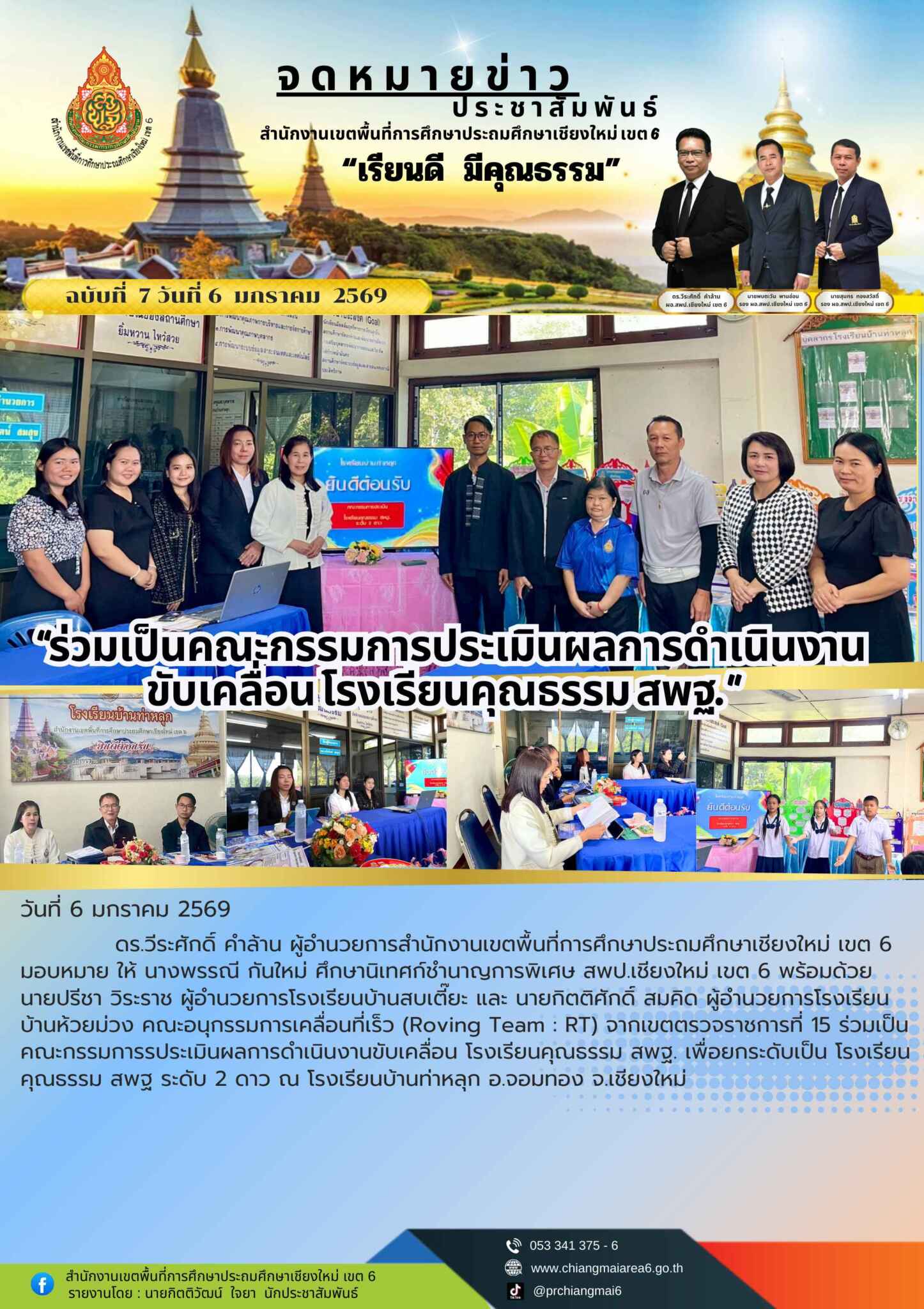 วันที่ 6 มกราคม 2569 ดร.วีระศักดิ์ คำล้าน ผู้อำนวยการสำนักงานเขตพื้นที่การศึกษาประถมศึกษาเชียงใหม่ เขต 6 มอบหมาย ให้ นางพรรณี กันใหม่ ศึกษานิเทศก์ชำนาญการพิเศษ สพป.เชียงใหม่ เขต 6 พร้อมด้วย นายปรีชา วิระราช ผู้อำนวยการโรงเรียนบ้านสบเตี๊ยะ และ นายกิตติศักดิ์ สมคิด ผู้อำนวยการโรงเรียนบ้านห้วยม่วง คณะอนุกรรมการเคลื่อนที่เร็ว (Roving Team : RT) จากเขตตรวจราชการที่ 15 ร่วมเป็นคณะกรรมการรประเมินผลการดำเนินงานขับเคลื่อน โรงเรียนคุณธรรม สพฐ. เพื่อยกระดับเป็น โรงเรียนคุณธรรม สพฐ ระดับ 2 ดาว ณ โรงเรียนบ้านท่าหลุก อ.จอมทอง จ.เชียงใหม่