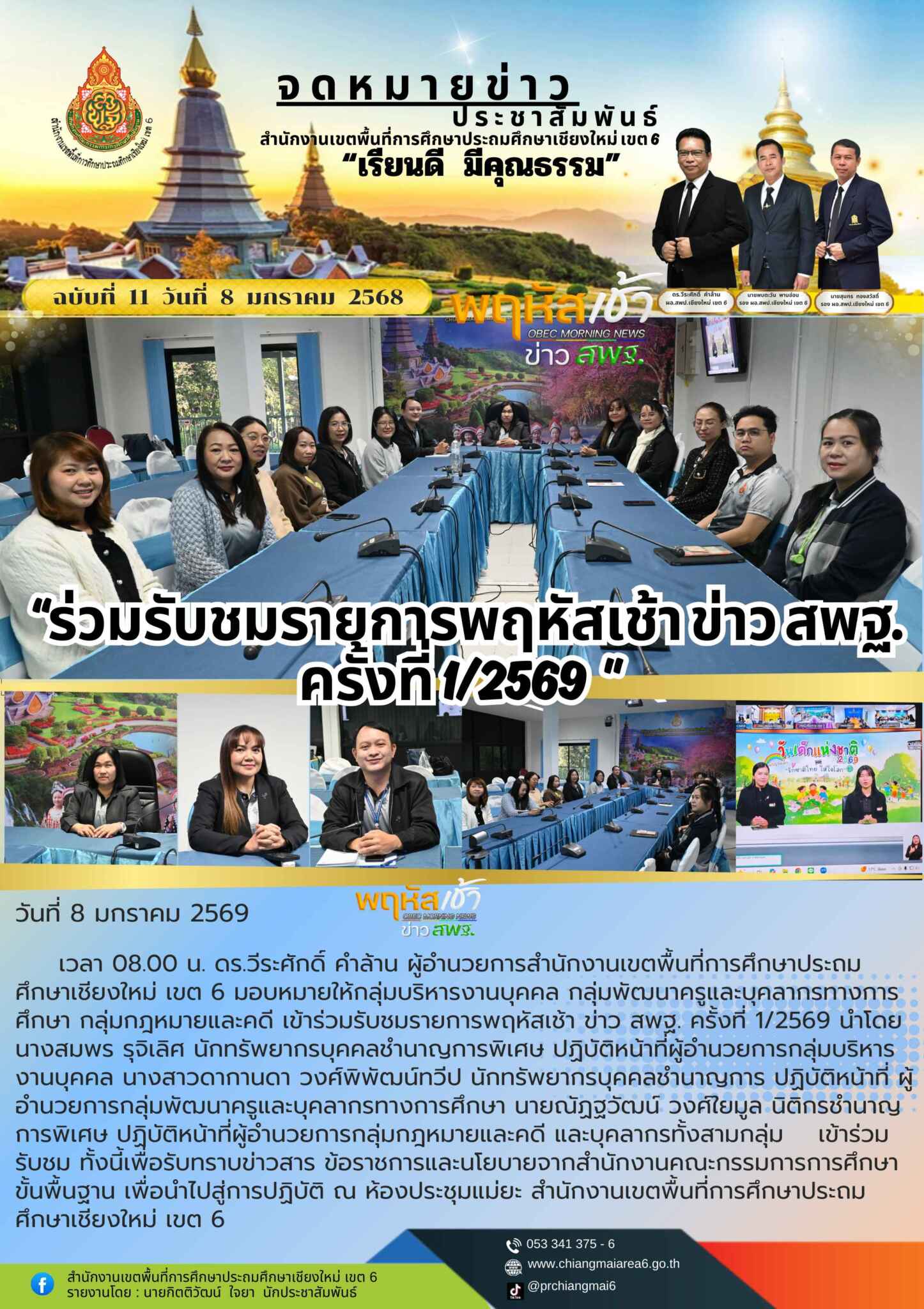 วันที่ 8 มกราคม 2569 เวลา 08.00 น. ดร.วีระศักดิ์ คำล้าน ผู้อำนวยการสำนักงานเขตพื้นที่การศึกษาประถมศึกษาเชียงใหม่ เขต 6 มอบหมายให้กลุ่มบริหารงานบุคคล กลุ่มพัฒนาครูและบุคลากรทางการศึกษา กลุ่มกฎหมายและคดี เข้าร่วมรับชมรายการพฤหัสเช้า ข่าว สพฐ. ครั้งที่ 1/2569 นำโดยนางสมพร รุจิเลิศ นักทรัพยากรบุคคลชำนาญการพิเศษ ปฏิบัติหน้าที่ผู้อำนวยการกลุ่มบริหารงานบุคคล นางสาวดากานดา วงศ์พิพัฒน์ทวีป นักทรัพยากรบุคคลชำนาญการ ปฏิบัติหน้าที่ผู้อำนวยการกลุ่มพัฒนาครูและบุคลากรทางการศึกษา นายณัฏฐวัฒน์ วงศ์ใยมูล นิติกรชำนาญการพิเศษ ปฏิบัติหน้าที่ผู้อำนวยการกลุ่มกฎหมายและคดี และบุคลากรทั้งสามกลุ่ม เข้าร่วมรับชม ทั้งนี้เพื่อรับทราบข่าวสาร ข้อราชการและนโยบายจากสำนักงานคณะกรรมการการศึกษาขั้นพื้นฐาน เพื่อนำไปสู่การปฏิบัติ ณ ห้องประชุมแม่ยะ สำนักงานเขตพื้นที่การศึกษาประถมศึกษาเชียงใหม่ เขต 6