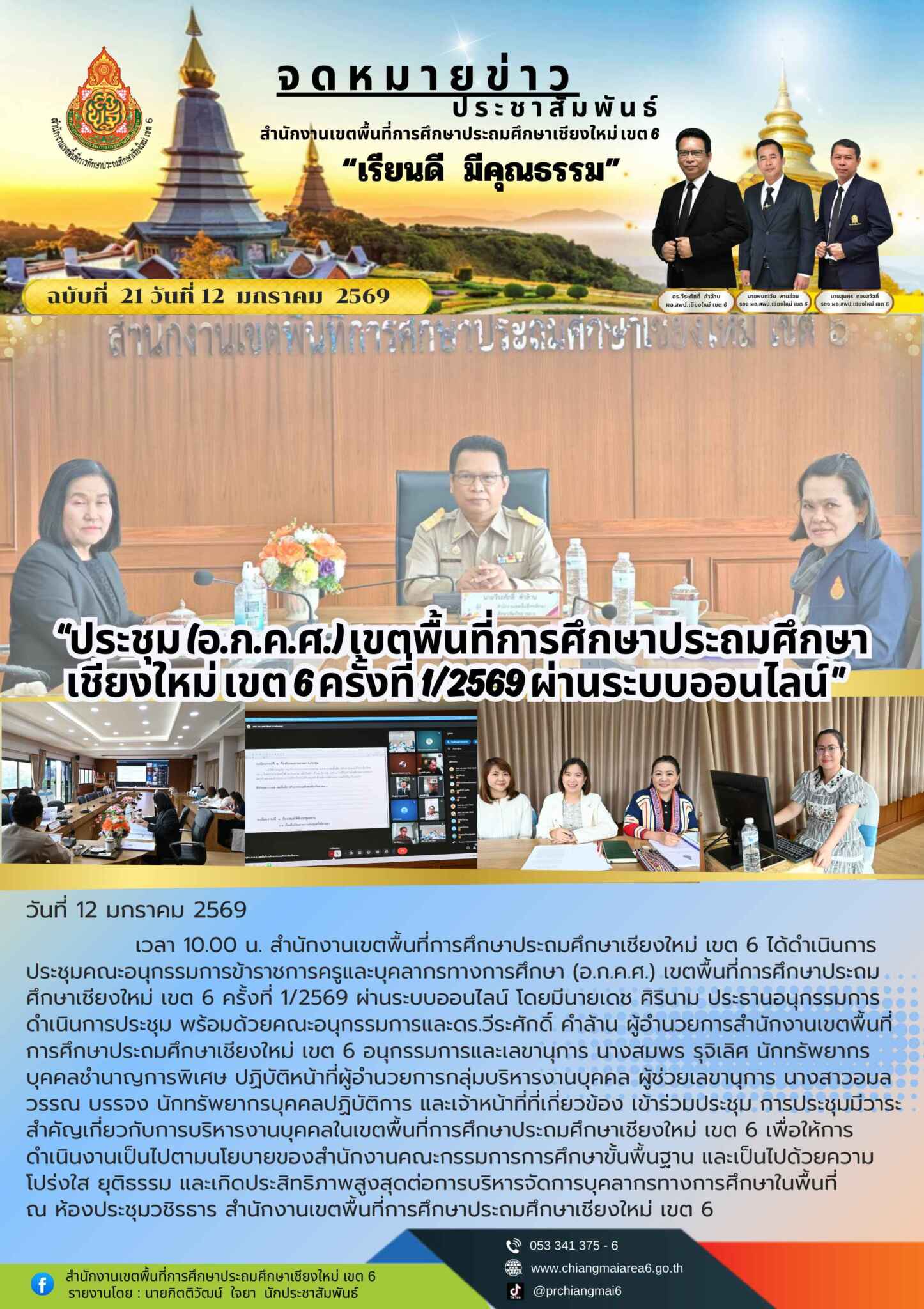 วันที่ 12 มกราคม 2569 เวลา 10.00 น. สำนักงานเขตพื้นที่การศึกษาประถมศึกษาเชียงใหม่ เขต 6 ได้ดำเนินการประชุมคณะอนุกรรมการข้าราชการครูและบุคลากรทางการศึกษา (อ.ก.ค.ศ.) เขตพื้นที่การศึกษาประถมศึกษาเชียงใหม่ เขต 6 ครั้งที่ 1/2569 ผ่านระบบออนไลน์ โดยมีนายเดช ศิรินาม ประธานอนุกรรมการดำเนินการประชุม พร้อมด้วยคณะอนุกรรมการและดร.วีระศักดิ์ คำล้าน ผู้อำนวยการสำนักงานเขตพื้นที่การศึกษาประถมศึกษาเชียงใหม่ เขต 6 อนุกรรมการและเลขานุการ นางสมพร รุจิเลิศ นักทรัพยากรบุคคลชำนาญการพิเศษ ปฏิบัติหน้าที่ผู้อำนวยการกลุ่มบริหารงานบุคคล ผู้ช่วยเลขานุการ นางสาวอมลวรรณ บรรจง นักทรัพยากรบุคคลปฏิบัติการ และเจ้าหน้าที่ที่เกี่ยวข้อง เข้าร่วมประชุม การประชุมมีวาระสำคัญเกี่ยวกับการบริหารงานบุคคลในเขตพื้นที่การศึกษาประถมศึกษาเชียงใหม่ เขต 6 เพื่อให้การดำเนินงานเป็นไปตามนโยบายของสำนักงานคณะกรรมการการศึกษาขั้นพื้นฐาน และเป็นไปด้วยความโปร่งใส ยุติธรรม และเกิดประสิทธิภาพสูงสุดต่อการบริหารจัดการบุคลากรทางการศึกษาในพื้นที่ ณ ห้องประชุมวชิรธาร สำนักงานเขตพื้นที่การศึกษาประถมศึกษาเชียงใหม่ เขต 6
