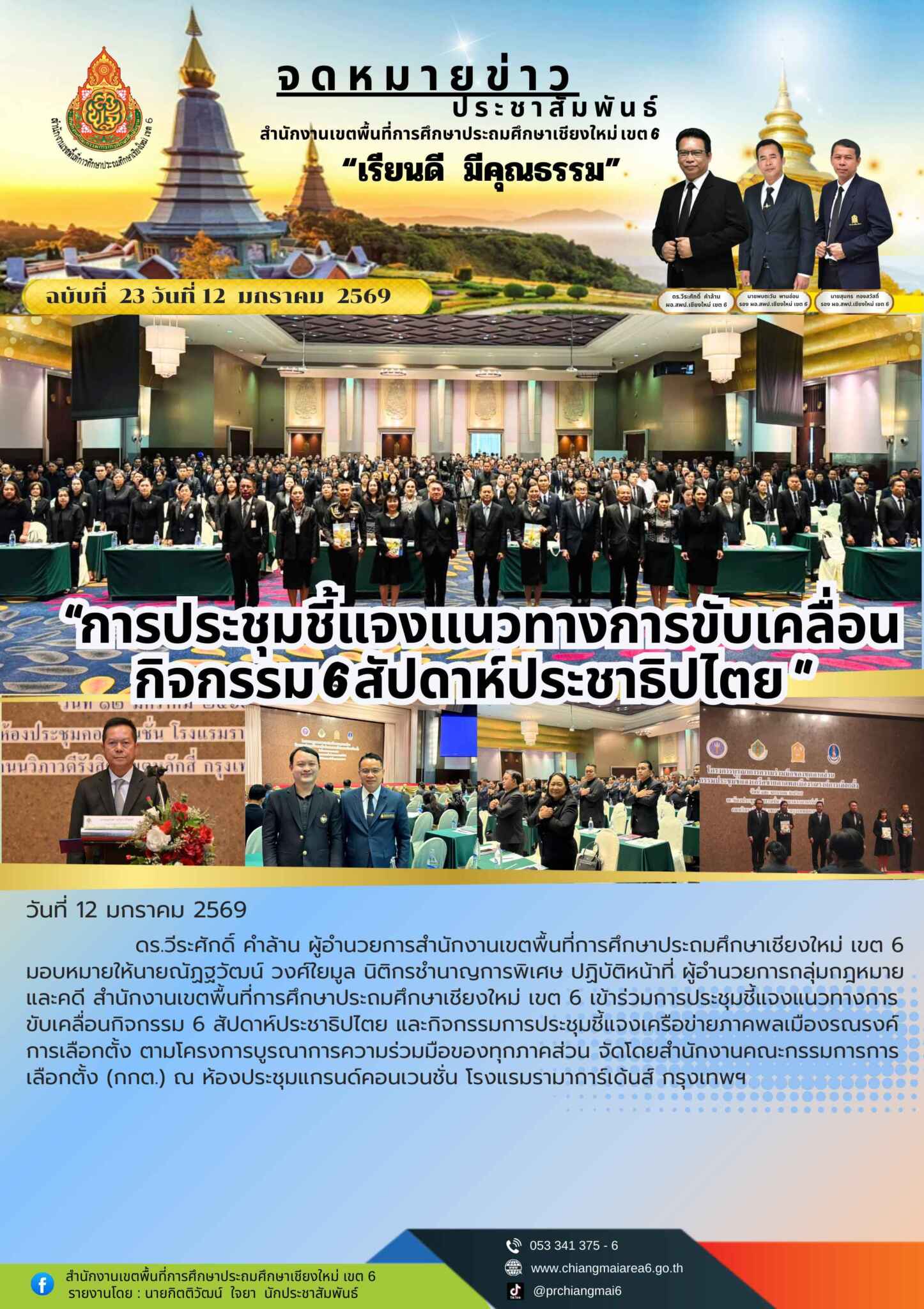 วันที่12 มกราคม 2569 ดร.วีระศักดิ์ คำล้าน ผู้อำนวยการสำนักงานเขตพื้นที่การศึกษาประถมศึกษาเชียงใหม่ เขต 6 มอบหมายให้นายณัฏฐวัฒน์ วงศ์ใยมูล นิติกรชำนาญการพิเศษ ปฏิบัติหน้าที่ ผู้อำนวยการกลุ่มกฎหมายและคดี สำนักงานเขตพื้นที่การศึกษาประถมศึกษาเชียงใหม่ เขต 6 เข้าร่วมการประชุมชี้แจงแนวทางการขับเคลื่อนกิจกรรม 6 สัปดาห์ประชาธิปไตย และกิจกรรมการประชุมชี้แจงเครือข่ายภาคพลเมืองรณรงค์การเลือกตั้ง ตามโครงการบูรณาการความร่วมมือของทุกภาคส่วน จัดโดยสำนักงานคณะกรรมการการเลือกตั้ง (กกต.) ณ ห้องประชุมแกรนด์คอนเวนชั่น โรงแรมรามาการ์เด้นส์ กรุงเทพฯ