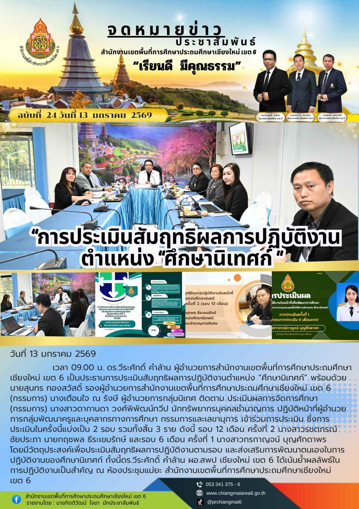 วันที่ 13 มกราคม 2569 เวลา 09.00 น. ดร.วีระศักดิ์ คำล้าน ผู้อำนวยการสำนักงานเขตพื้นที่การศึกษาประถมศึกษาเชียงใหม่ เขต 6 เป็นประธานการประเมินสัมฤทธิผลการปฏิบัติงานตำแหน่ง “ศึกษานิเทศก์” พร้อมด้วยนายสุนทร ทองสวัสดิ์ รองผู้อำนวยการสำนักงานเขตพื้นที่การศึกษาประถมศึกษาเชียงใหม่ เขต 6 (กรรมการ) นางเตือนใจ ณ รังษี ผู้อำนวยการกลุ่มนิเทศ ติดตาม ประเมินผลการจัดการศึกษา (กรรมการ) นางสาวดากานดา วงศ์พิพัฒน์ทวีป นักทรัพยากรบุคคลชำนาญการ ปฏิบัติหน้าที่ผู้อำนวยการกลุ่มพัฒนาครูและบุคลากรทางการศึกษา กรรมการและเลขานุการ เข้าร่วมการประเมิน ซึ่งการประเมินในครั้งนี้แบ่งเป็น 2 รอบ รวมทั้งสิ้น 3 ราย ดังนี้ รอบ 12 เดือน ครั้งที่ 2 นางสาวรชตภรณ์ ชัยประภา นายกฤชพล ธีระเขมรักษ์ และรอบ 6 เดือน ครั้งที่ 1 นางสาวกรกาญจน์ บุญศักดาพร โดยมีวัตถุประสงค์เพื่อประเมินสัมฤทธิผลการปฏิบัติงานตามรอบ และส่งเสริมการพัฒนาตนเองในการปฏิบัติงานของศึกษานิเทศก์ ทั้งนี้ดร.วีระศักดิ์ คำล้าน ผอ.สพป เชียงใหม่ เขต 6 ได้เน้นย้ำผลลัพธ์ในการปฏิบัติงานเป็นสำคัญ ณ ห้องประชุมแม่ยะ สำนักงานเขตพื้นที่การศึกษาประถมศึกษาเชียงใหม่ เขต 6