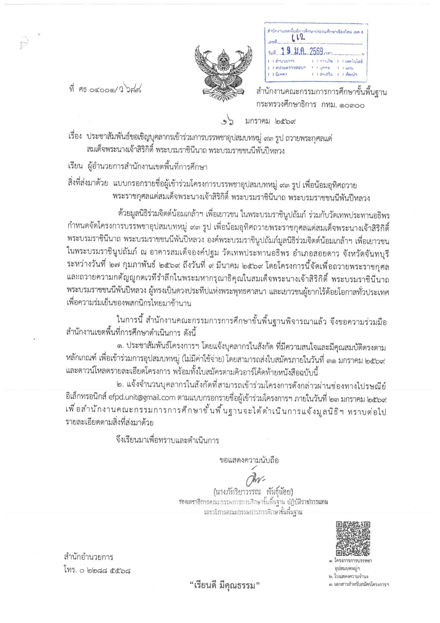 ข่าวประชาสัมพันธ์ “ประชาสัมพันธ์ ขอเชิญร่วมการบรรพชาอุปสมบมหมู่ 33 รูป ถวายพระกุศลแด่สมเด็จพระนางเจ้าสิริกิติ์ พระบรมราชินีนาถ พระบรมราชชนนีพันปีหลวง กิตติวัฒน์ ใจยา มกราคม 20, 2026 1 minute read รายละเอียดตามเอกสารแนบมาพร้อมนี้ ว688Download Post navigation Previous: “สพป.เชียงใหม่ เขต 6 นิเทศออนไลน์เพื่อเตรียจมความพร้อมรับการประเมินคุณภาพภายนอก”Next: “ประชาสัมพันธ์ ผู้ที่สนใจเข้าร่วมกิจกรรมประกวดผลงานศิลปะเยาวชนนานาชาติ Related Stories ข่าวประชาสัมพันธ์ “ขอเชิญนักเรียนที่สนใจสมัครเข้าร่วมกิจกรรมประกวดรางวัล Zayed Sustainability Prize ประจำปี 2027 ใน 6 สาขา ได้แก่ สุขภาพ อาหาร พลังงาน น้ำ การรับมือกับการเปลี่ยวนแปลงสภาพภูมิอากาศ รายละเอียดตามเอกสารแนบมาพร้อมนี้ กิตติวัฒน์ ใจยา เมษายน 24, 2026 ข่าวประชาสัมพันธ์ “ขอเผยแพร่ผลงานทางวิชาการ” กิตติวัฒน์ ใจยา เมษายน 20, 2026 ข่าวประชาสัมพันธ์ “ประชาสัมพันธ์ การประกวดออกแบบโล่และตราสัญลักษณ์การบริหารจัดการเรื่องร้องทุกข์โดดเด่น” กิตติวัฒน์ ใจยา มีนาคม 20, 2026
