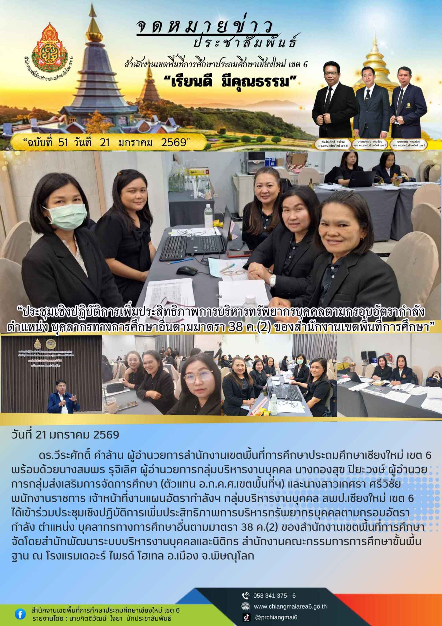 วันที่ 21 มกราคม 2569 ดร.วีระศักดิ์ คำล้าน ผู้อำนวยการสำนักงานเขตพื้นที่การศึกษาประถมศึกษาเชียงใหม่ เขต 6 พร้อมด้วยนางสมพร รุจิเลิศ ผู้อำนวยการกลุ่มบริหารงานบุคคล นางทองสุข ปิยะวงษ์ ผู้อำนวยการกลุ่มส่งเสริมการจัดการศึกษา (ตัวแทน อ.ก.ค.ศ.เขตพื้นที่ฯ) และนางสาวเกศรา ศรีวิชัย พนักงานราชการ เจ้าหน้าที่งานแผนอัตรากำลังฯ กลุ่มบริหารงานบุคคล สพป.เชียงใหม่ เขต 6 ได้เข้าร่วมประชุมเชิงปฏิบัติการเพิ่มประสิทธิภาพการบริหารทรัพยากรบุคคลตามกรอบอัตรากำลัง ตำแหน่ง บุคลากรทางการศึกษาอื่นตามมาตรา 38 ค.(2) ของสำนักงานเขตพื้นที่การศึกษา จัดโดยสำนักพัฒนาระบบบริหารงานบุคคลและนิติกร สำนักงานคณะกรรมการการศึกษาขั้นพื้นฐาน ณ โรงแรมเดอะร์ ไพรด์ โฮเทล อ.เมือง จ.พิษณุโลก