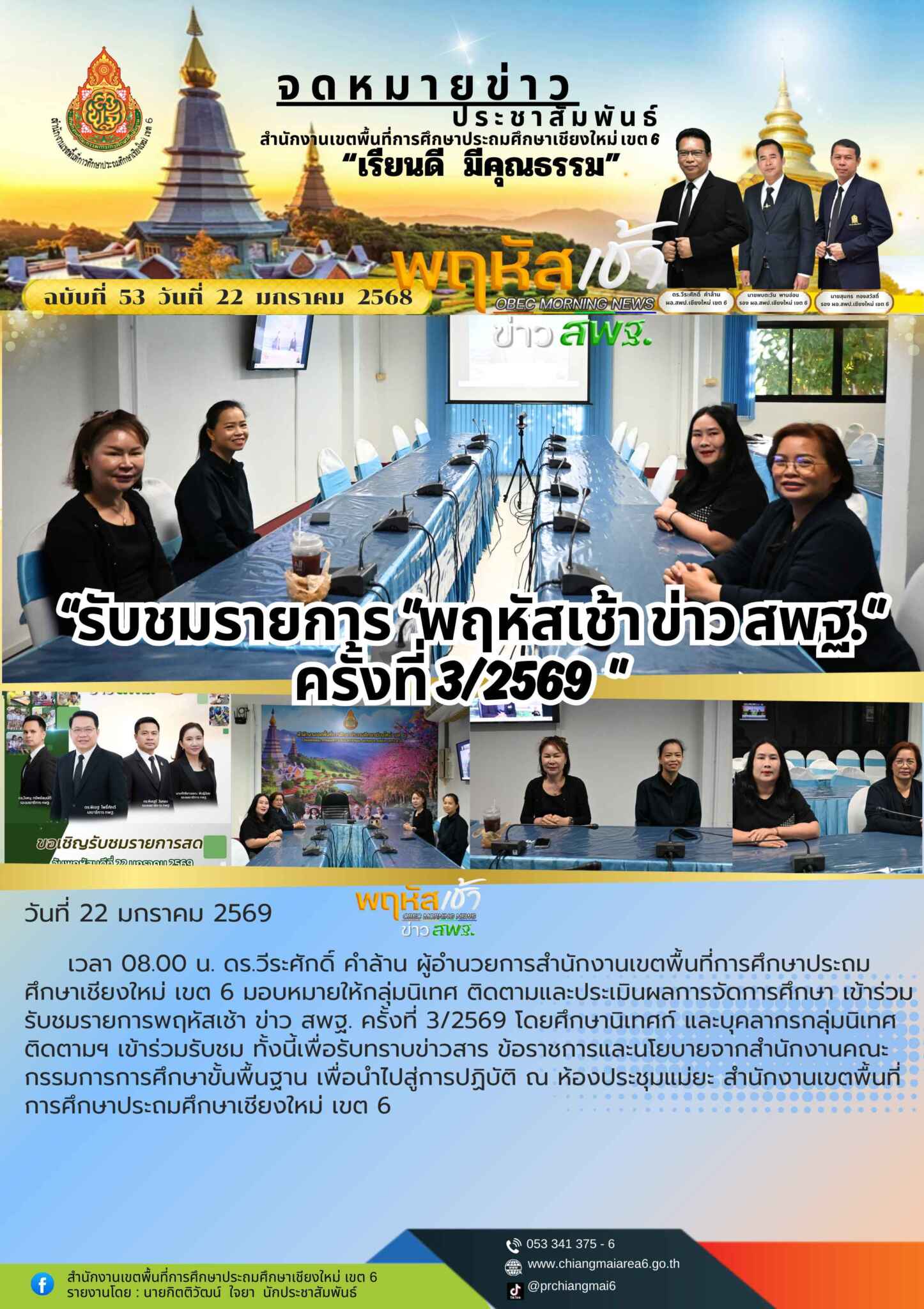 วันที่ 22 มกราคม 2569 เวลา 08.00 น. ดร.วีระศักดิ์ คำล้าน ผู้อำนวยการสำนักงานเขตพื้นที่การศึกษาประถมศึกษาเชียงใหม่ เขต 6 มอบหมายให้กลุ่มนิเทศ ติดตามและประเมินผลการจัดการศึกษา เข้าร่วมรับชมรายการพฤหัสเช้า ข่าว สพฐ. ครั้งที่ 3/2569 โดยศึกษานิเทศก์ และบุคลากรกลุ่มนิเทศ ติดตามฯ เข้าร่วมรับชม ทั้งนี้เพื่อรับทราบข่าวสาร ข้อราชการและนโยบายจากสำนักงานคณะกรรมการการศึกษาขั้นพื้นฐาน เพื่อนำไปสู่การปฏิบัติ ณ ห้องประชุมแม่ยะ สำนักงานเขตพื้นที่การศึกษาประถมศึกษาเชียงใหม่ เขต 6