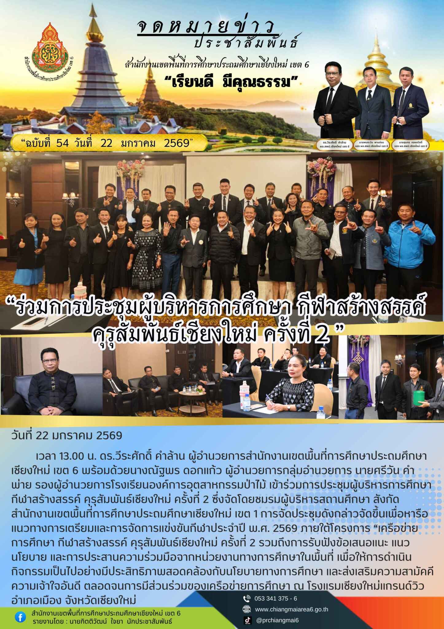 วันที่ 22 มกราคม 2568 เวลา 13.00 น. ดร.วีระศักดิ์ คำล้าน ผู้อำนวยการสำนักงานเขตพื้นที่การศึกษาประถมศึกษาเชียงใหม่ เขต 6 พร้อมด้วยนางณัฐพร ดอกแก้ว ผู้อำนวยการกลุ่มอำนวยการ นายศรีวัน คำพ่าย รองผู้อำนวยการโรงเรียนองค์การอุตสาหกรรมป่าไม้ เข้าร่วมการประชุมผู้บริหารการศึกษา กีฬาสร้างสรรค์ คุรุสัมพันธ์เชียงใหม่ ครั้งที่ 2 ซึ่งจัดโดยชมรมผู้บริหารสถานศึกษา สังกัดสำนักงานเขตพื้นที่การศึกษาประถมศึกษาเชียงใหม่ เขต 1 การจัดประชุมดังกล่าวจัดขึ้นเพื่อหารือแนวทางการเตรียมและการจัดการแข่งขันกีฬาประจำปี พ.ศ. 2569 ภายใต้โครงการ “เครือข่ายการศึกษา กีฬาสร้างสรรค์ คุรุสัมพันธ์เชียงใหม่ ครั้งที่ 2 รวมถึงการรับฟังข้อเสนอแนะ แนวนโยบาย และการประสานความร่วมมือจากหน่วยงานทางการศึกษาในพื้นที่ เพื่อให้การดำเนินกิจกรรมเป็นไปอย่างมีประสิทธิภาพสอดคล้องกับนโยบายทางการศึกษา และส่งเสริมความสามัคคี ความเจ้าใจอันดี ตลอดจนการมีส่วนร่วมของเครือข่ายการศึกษา ณ โรงแรมเชียงใหม่แกรนด์วิว อำเภอเมือง จังหวัดเชียงใหม่
