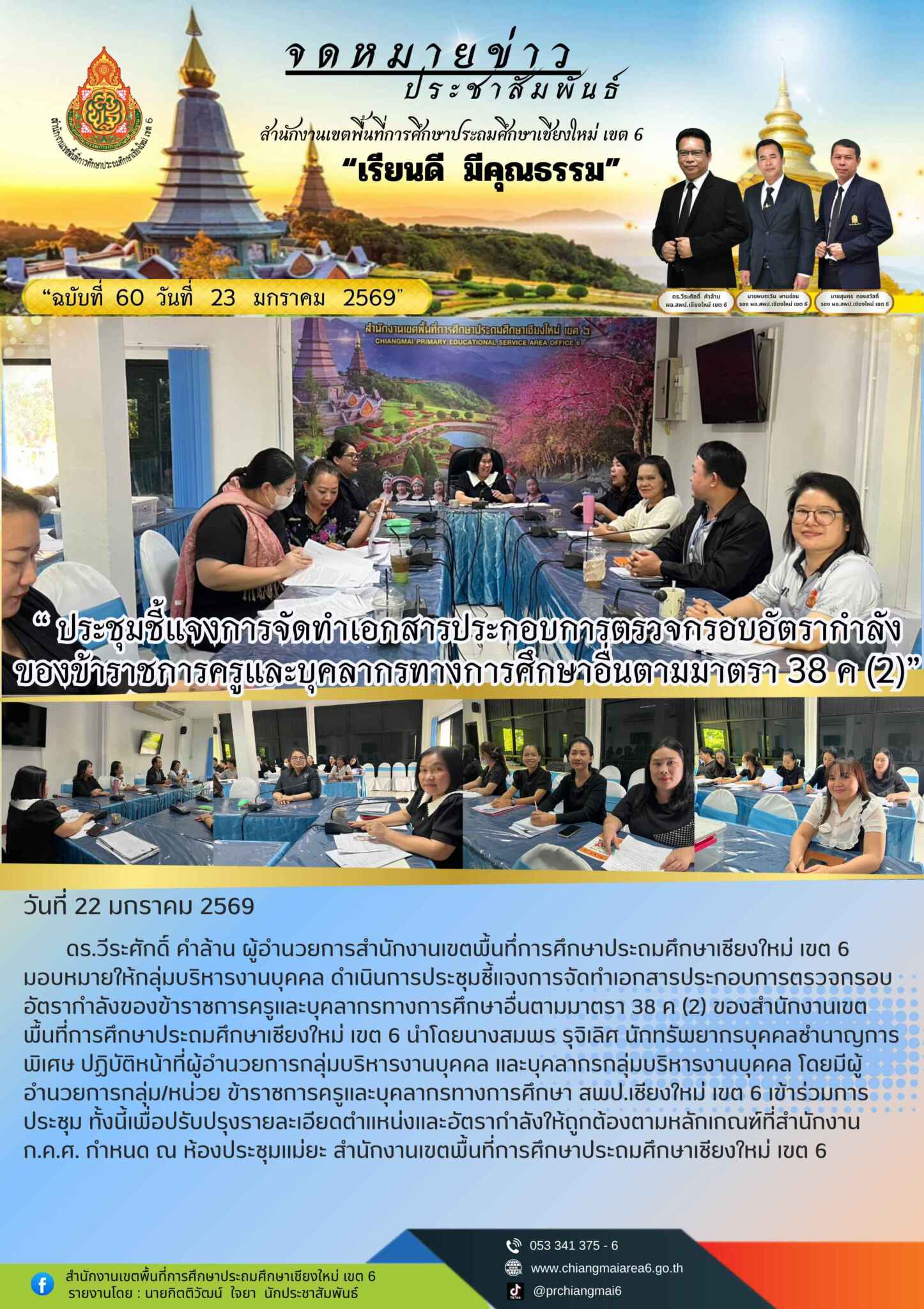วันที่ 22 มกราคม 2569 ดร.วีระศักดิ์ คำล้าน ผู้อำนวยการสำนักงานเขตพื้นทึ่การศึกษาประถมศึกษาเชียงใหม่ เขต 6 มอบหมายให้กลุ่มบริหารงานบุคคล ดำเนินการประชุมชี้แจงการจัดทำเอกสารประกอบการตรวจกรอบอัตรากำลังของข้าราชการครูและบุคลากรทางการศึกษาอื่นตามมาตรา 38 ค (2) ของสำนักงานเขตพื้นที่การศึกษาประถมศึกษาเชียงใหม่ เขต 6 นำโดยนางสมพร รุจิเลิศ นักทรัพยากรบุคคลชำนาญการพิเศษ ปฏิบัติหน้าที่ผู้อำนวยการกลุ่มบริหารงานบุคคล และบุคลากรกลุ่มบริหารงานบุคคล โดยมีผู้อำนวยการกลุ่ม/หน่วย ข้าราชการครูและบุคลากรทางการศึกษา สพป.เชียงใหม่ เขต 6 เข้าร่วมการประชุม ทั้งนี้เพื่อปรับปรุงรายละเอียดตำแหน่งและอัตรากำลังให้ถูกต้องตามหลักเกณฑ์ที่สำนักงาน ก.ค.ศ. กำหนด ณ ห้องประชุมแม่ยะ สำนักงานเขตพื้นที่การศึกษาประถมศึกษาเชียงใหม่ เขต 6
