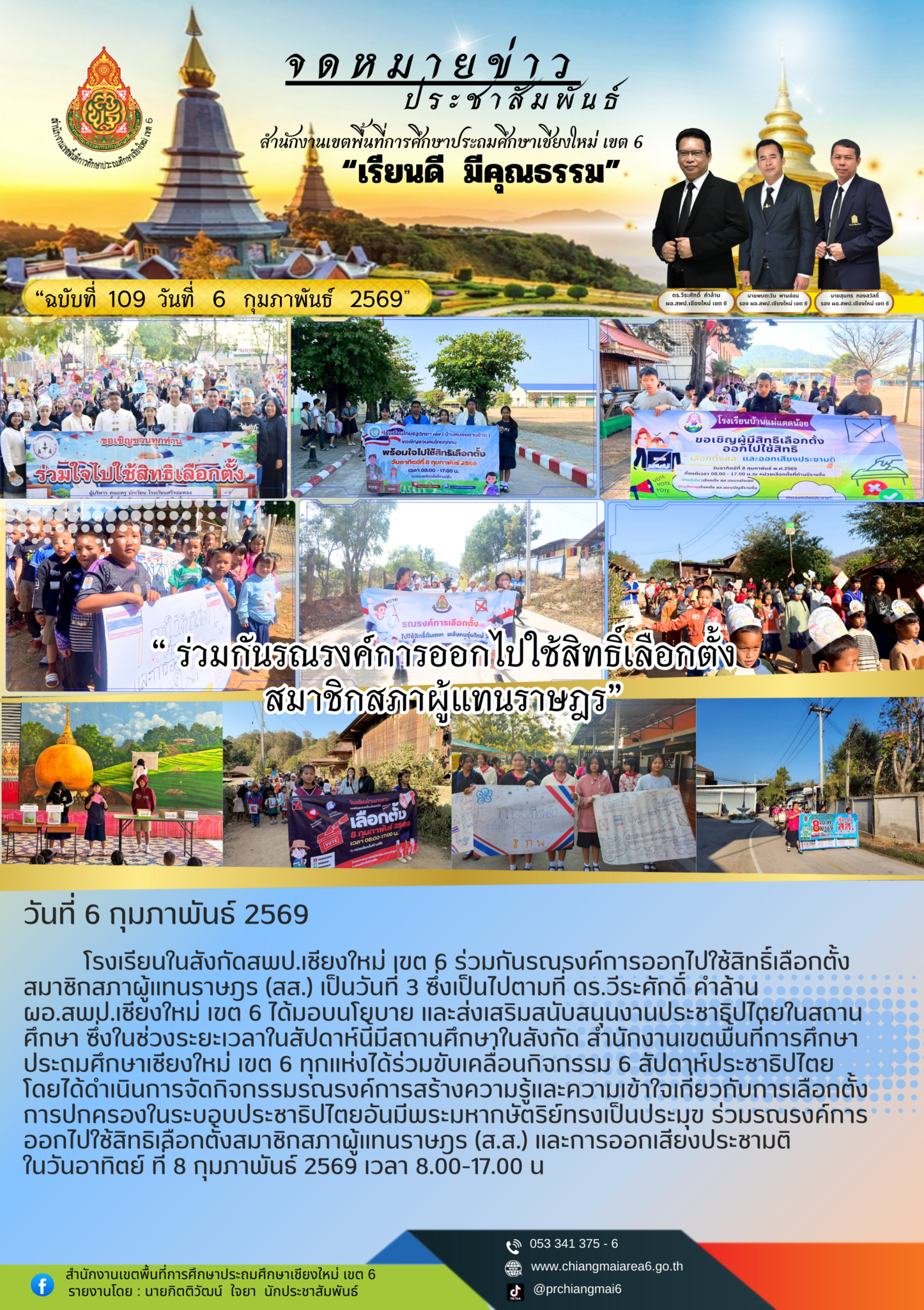 วันที่ 6 กุมภาพันธ์ 2569 โรงเรียนในสังกัดสพป.เชียงใหม่ เขต 6 ร่วมกันรณรงค์การออกไปใช้สิทธิ์เลือกตั้งสมาชิกสภาผู้แทนราษฎร (สส.) เป็นวันที่ 3 ซึ่งเป็นไปตามที่ ดร.วีระศักดิ์ คำล้าน ผอ.สพป.เชียงใหม่ เขต 6 ได้มอบนโยบาย และส่งเสริมสนับสนุนงานประชาธิปไตยในสถานศึกษา ซึ่งในช่วงระยะเวลาในสัปดาห์นี้มีสถานศึกษาในสังกัด สำนักงานเขตพื้นที่การศึกษาประถมศึกษาเชียงใหม่ เขต 6 ทุกแห่งได้ร่วมขับเคลื่อนกิจกรรม 6 สัปดาห์ประชาธิปไตย โดยได้ดำเนินการจัดกิจกรรมรณรงค์การสร้างความรู้และความเข้าใจเกี่ยวกับการเลือกตั้ง การปกครองในระบอบประชาธิปไตยอันมีพระมหากษัตริย์ทรงเป็นประมุข ร่วมรณรงค์การออกไปใช้สิทธิเลือกตั้งสมาชิกสภาผู้แทนราษฎร (ส.ส.) และการออกเสียงประชามติ ในวันอาทิตย์ ที่ 8 กุมภาพันธ์ 2569 เวลา 8.00-17.00 น