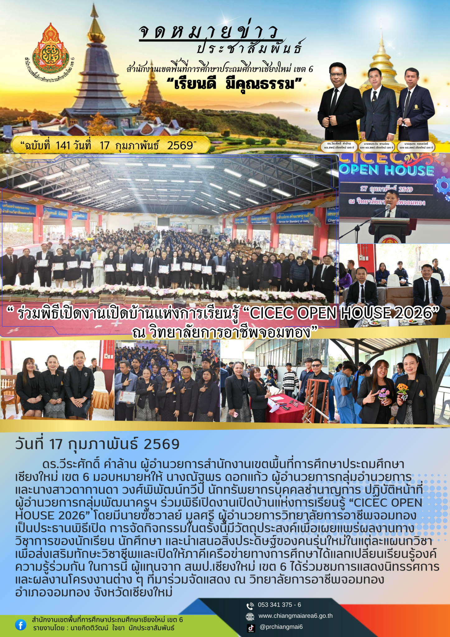 นที่ 17 กุมภาพันธ์ 2569 ดร.วีระศักดิ์ คำล้าน ผู้อำนวยการสำนักงานเขตพื้นที่การศึกษาประถมศึกษาเชียงใหม่ เขต 6 มอบหมายหให้ นางณัฐพร ดอกแก้ว ผู้อำนวยการกลุ่มอำนวยการ และนางสาวดากานดา วงศ์พิพัฒน์ทวีป นักทรัพยากรบุคคลชำนาญการ ปฏิบัติหน้าที่ผู้อำนวยการกลุ่มพัฒนาครูฯ ร่วมพิธีเปิดงานเปิดบ้านแห่งการเรียนรู้ “CICEC OPEN HOUSE 2026” โดยมีนายฃัชวาลย์ มูลศรี ผู้อำนวยการวิทยาลัยการอาชีพจอมทอง เป็นประธานพิธีเปิด การจัดกิจกรรมในตรั้งนี้มีวัตถุประสงค์เพื่อเผยแพร่ผลงานทางวิชาการของนักเรียน นักศึกษา และนำเสนอสิ่งประดิษฐ์ของคนรุ่นใหม่ในแต่ละแผนกวิชา เพื่อส่งเสริมทักษะวิชาชีพและเปิดให้ภาคีเครือข่ายทางการศึกษาได้แลกเปลี่ยนเรียนรู้องค์ความรู้ร่วมกัน ในการนี้ ผู้แทนจาก สพป.เชียงใหม่ เขต 6 ได้ร่วมชมการแสดงนิทรรศการและผลงานโครงงานต่าง ๆ ที่มาร่วมจัดแสดง ณ วิทยาลัยการอาชีพจอมทอง อำเภอจอมทอง จังหวัดเชียงใหม่