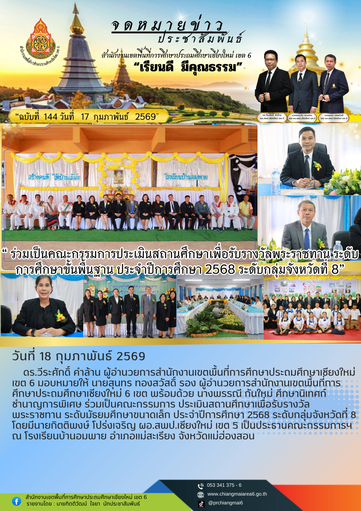 วันที่ 17 กุมภาพันธ์ 2569 ดร.วีระศักดิ์ คำล้าน ผู้อำนวยการสำนักงานเขตพื้นที่การศึกษาประถมศึกษาเชียงใหม่ เขต 6 มอบหมายให้ นายสุนทร ทองสวัสดิ์ รอง ผู้อำนวยการสำนักงานเขตพื้นที่การศึกษาประถมศึกษาเชียงใหม่ 6 พร้อมด้วย นางพรรณี กันใหม่ ศึกษานิเทศก์ชำนาญการพิเศษ ร่วมเป็นคณะกรรมการ ประเมินสถานศึกษาเพื่อรับรางวัลพระราชทาน ระดับมัธยมศึกษาขนาดเล็ก ประจำปีการศึกษา 2568 ระดับกลุ่มจังหวัดที่ 8 ณ โรงเรียนบ้านอมพาย อำเภอแม่สะเรียง จังหวัดแม่ฮ่องสอน ในภาคเช้า มี ดร.เอกชัย จันทา ศึกษาธิการจังหวัดแม่ฮ่องสอน กล่าวให้การต้อนรับ นายพิพัฒน์ วนาสถิตย์ ผู้อำนวยการโรงเรียนบ้านอมพาย เป็นผู้ให้ข้อมูลเบื้องต้นของสถานศึกษา นายวิมล สามเมือง ปลัดอาวุโสอำเภอแม่สะเรียง และนายประพันธ์ วิริยะภาพ อาสาสมัครโครงการกองทุนการศึกษาประจำจังหวัด กล่าวคำนิยมสถานศึกษา จากนั้น นายกิตติพงษ์ โปร่งเจริญ ผอ.สพป.เชียงใหม่ เขต 5 ประธานคณะกรรมการ พร้อมคณะกรรมการ ได้เดินเยี่ยมชมบูธนิทรรศการประสบการณ์เรียนรู้ของนักเรียนโรงเรียนบ้านอมพาย จำนวน 9 บูธในภาคบ่าย คณะกรรมการ เข้าเยี่ยมชมข้อมูลเอกสารการประเมินสถานศึกษาทั้ง 5 ด้าน อันได้แก่ ด้านที่ 1 คุณภาพผู้เรียน, ด้านที่ 2 การบริหารหลักสูตรและงานวิชาการ, ด้านที่ 3 การบริหารและการจัดการศึกษา, ด้านที่ 4 การจัดการเรียนรู้ที่เน้นผู้เรียนเป็นสำคัญ และด้านที่ 5 ความดีเด่นของสถานศึกษา หลักจากนั้น คณะกรรมการได้กล่าวสรุปและให้ข้อเสนอแนะนำ