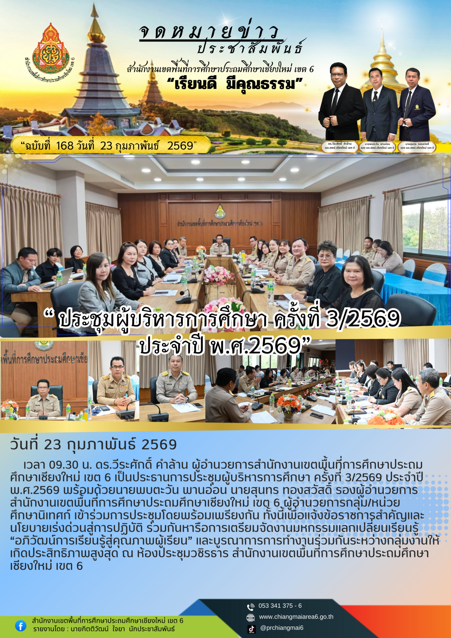 วันที่ 23 กุมภาพันธ์ 2569 เวลา 09.30 น. ดร.วีระศักดิ์ คำล้าน ผู้อำนวยการสำนักงานเขตพื้นที่การศึกษาประถมศึกษาเชียงใหม่ เขต 6 เป็นประธานการประชุมผู้บริหารการศึกษา ครั้งที่ 3/2569 ประจำปี พ.ศ.2569 พร้อมด้วยนายพบตะวัน พานอ่อน นายสุนทร ทองสวัสดิ์ รองผู้อำนวยการสำนักงานเขตพื้นที่การศึกษาประถมศึกษาเชียงใหม่ เขต 6 ผู้อำนวยการกลุ่ม/หน่วย ศึกษานิเทศก์ เข้าร่วมการประชุมโดยพร้อมเพรียงกัน ทั้งนี้เพื่อแจ้งข้อราชการสำคัญและนโยบายเร่งด่วนสู่การปฏิบัติ ร่วมกันหารือการเตรียมจัดงานมหกรรมแลกเปลี่ยนเรียนรู้ “อภิวัฒน์การเรียนรู้สู่คุณภาพผู้เรียน” และบูรณาการการทำงานร่วมกันระหว่างกลุ่มงานให้เกิดประสิทธิภาพสูงสุด ณ ห้องประชุมวชิรธาร สำนักงานเขตพื้นที่การศึกษาประถมศึกษาเชียงใหม่ เขต 6