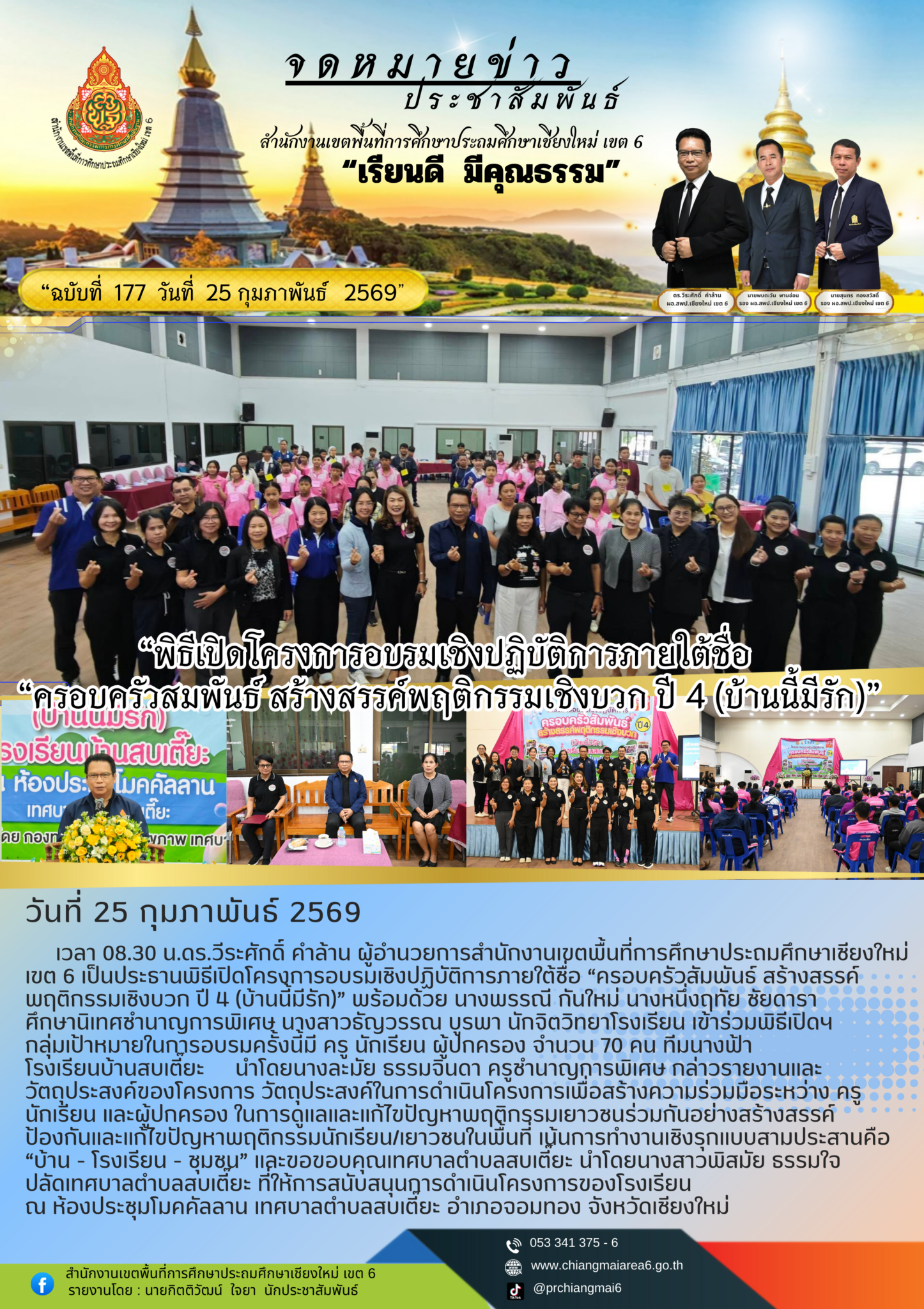 วันที่ 25 กุมภาพันธ์ 2569 เวลา 08.30 น.ดร.วีระศักดิ์ คำล้าน ผู้อำนวยการสำนักงานเขตพื้นที่การศึกษาประถมศึกษาเชียงใหม่ เขต 6 เป็นประธานพิธีเปิดโครงการอบรมเชิงปฏิบัติการภายใต้ชื่อ “ครอบครัวสัมพันธ์ สร้างสรรค์พฤติกรรมเชิงบวก ปี 4 (บ้านนี้มีรัก)” พร้อมด้วย นางพรรณี กันใหม่ นางหนึ่งฤทัย ชัยดารา ศึกษานิเทศชำนาญการพิเศษ นางสาวธัญวรรณ บูรพา นักจิตวิทยาโรงเรียน เข้าร่วมพิธีเปิดฯ กลุ่มเป้าหมายในการอบรมครั้งนี้มี ครู นักเรียน ผู้ปกครอง จำนวน 70 คน ทีมนางฟ้า โรงเรียนบ้านสบเตี๊ยะ นำโดยนางละมัย ธรรมจินดา ครูชำนาญการพิเศษ กล่าวรายงานและวัตถุประสงค์ของโครงการ วัตถุประสงค์ในการดำเนินโครงการเพื่อสร้างความร่วมมือระหว่าง ครู นักเรียน และผู้ปกครอง ในการดูแลและแก้ไขปัญหาพฤติกรรมเยาวชนร่วมกันอย่างสร้างสรรค์ ป้องกันและแก้ไขปัญหาพฤติกรรมนักเรียน/เยาวชนในพื้นที่ เน้นการทำงานเชิงรุกแบบสามประสานคือ “บ้าน – โรงเรียน – ชุมชน” และขอขอบคุณเทศบาลตำบลสบเตี๊ยะ นำโดยนางสาวพิสมัย ธรรมใจ ปลัดเทศบาลตำบลสบเตี๊ยะที่ให้การสนับสนุนการดำเนินโครงการของโรงเรียน ณ ห้องประชุมโมคคัลลาน เทศบาลตำบลสบเตี๊ยะ อำเภอจอมทอง จังหวัดเชียงใหม่