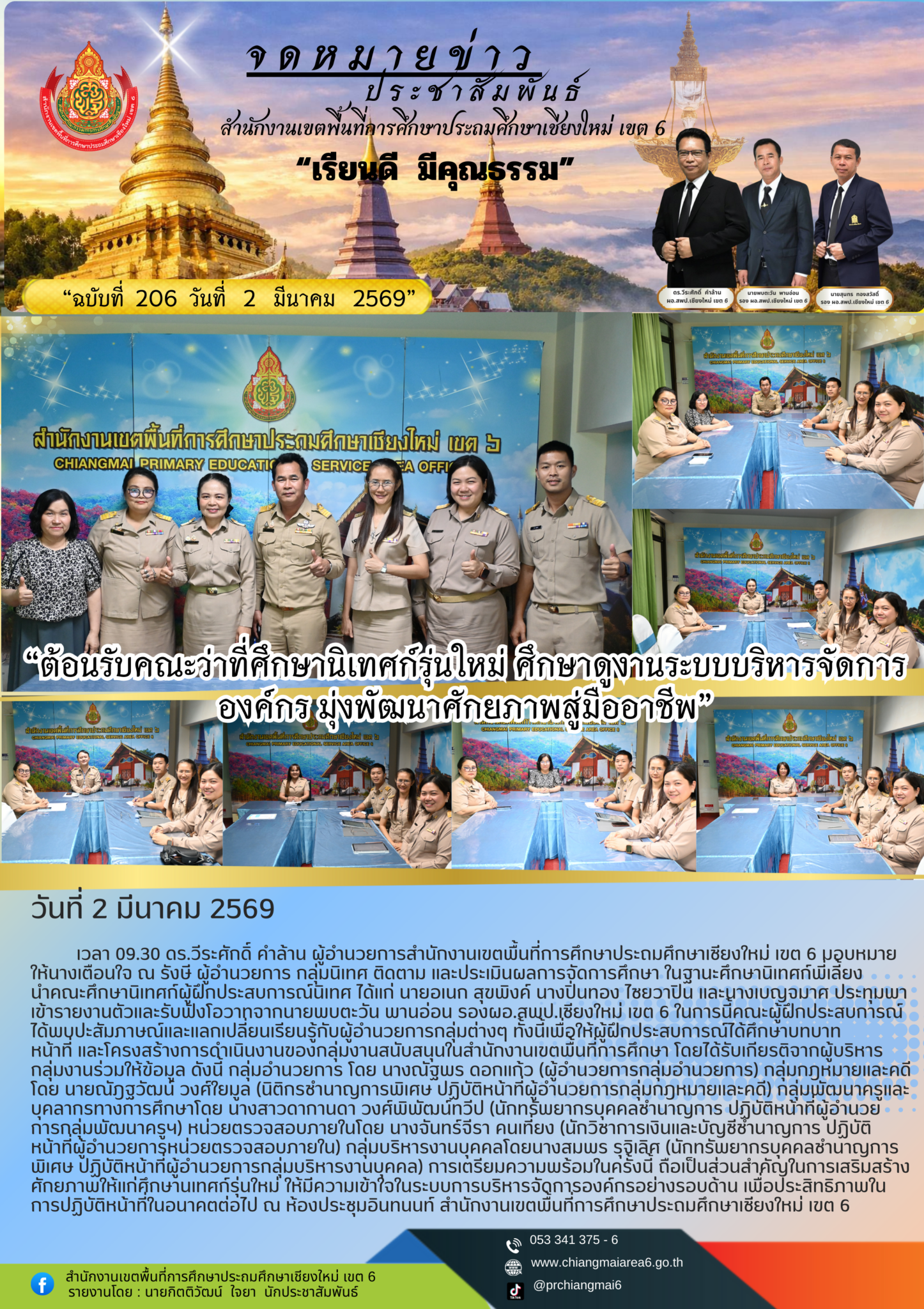 วันที่ 2 มีนาคม พ.ศ.2569 เวลา 09.30 ดร.วีระศักดิ์ คำล้าน ผู้อำนวยการสำนักงานเขตพื้นที่การศึกษาประถมศึกษาเชียงใหม่ เขต 6 มอบหมายให้นางเตือนใจ ณ รังษี ผู้อำนวยการ กลุ่มนิเทศ ติดตาม และประเมินผลการจัดการศึกษา ในฐานะศึกษานิเทศก์พี่เลี้ยง นำคณะศึกษานิเทศก์ผู้ฝึกประสบการณ์นิเทศ ได้แก่ นายอเนก สุขพิงค์ นางปิ่นทอง ไชยวาปิน และนางเบญจมาศ ประทุมพา เข้ารายงานตัวและรับฟังโอวาทจากนายพบตะวัน พานอ่อน รองผอ.สพป.เชียงใหม่ เขต 6 ในการนี้คณะผู้ฝึกประสบการณ์ได้พบปะสัมภาษณ์และแลกเปลี่ยนเรียนรู้กับผู้อำนวยการกลุ่มต่างๆ ทั้งนี้เพื่อให้ผู้ฝึกประสบการณ์ได้ศึกษาบทบาท หน้าที่ และโครงสร้างการดำเนินงานของกลุ่มงานสนับสนุนในสำนักงานเขตพื้นที่การศึกษา โดยได้รับเกียรติจากผู้บริหารกลุ่มงานร่วมให้ข้อมูล ดังนี้ กลุ่มอำนวยการ โดย นางณัฐพร ดอกแก้ว (ผู้อำนวยการกลุ่มอำนวยการ) กลุ่มกฎหมายและคดีโดย นายณัฎฐวัฒน์ วงศ์ใยมูล (นิติกรชำนาญการพิเศษ ปฏิบัติหน้าที่ผู้อำนวยการกลุ่มกฎหมายและคดี) กลุ่มพัฒนาครูและบุคลากรทางการศึกษาโดย นางสาวดากานดา วงศ์พิพัฒน์ทวีป (นักทรัพยากรบุคคลชำนาญการ ปฏิบัติหน้าที่ผู้อำนวยการกลุ่มพัฒนาครูฯ) หน่วยตรวจสอบภายในโดย นางจันทร์จีรา คนเที่ยง (นักวิชาการเงินและบัญชีชำนาญการ ปฏิบัติหน้าที่ผู้อำนวยการหน่วยตรวจสอบภายใน) กลุ่มบริหารงานบุคคลโดยนางสมพร รุจิเลิศ (นักทรัพยากรบุคคลชำนาญการพิเศษ ปฏิบัติหน้าที่ผู้อำนวยการกลุ่มบริหารงานบุคคล) การเตรียมความพร้อมในครั้งนี้ ถือเป็นส่วนสำคัญในการเสริมสร้างศักยภาพให้แก่ศึกษานเทศก์รุ่นใหม่ ให้มีความเข้าใจในระบบการบริหารจัดการองค์กรอย่างรอบด้าน เพื่อประสิทธิภาพในการปฏิบัติหน้าที่ในอนาคตต่อไป ณ ห้องประชุมอินทนนท์ สำนักงานเขตพื้นที่การศึกษาประถมศึกษาเชียงใหม่ เขต 6