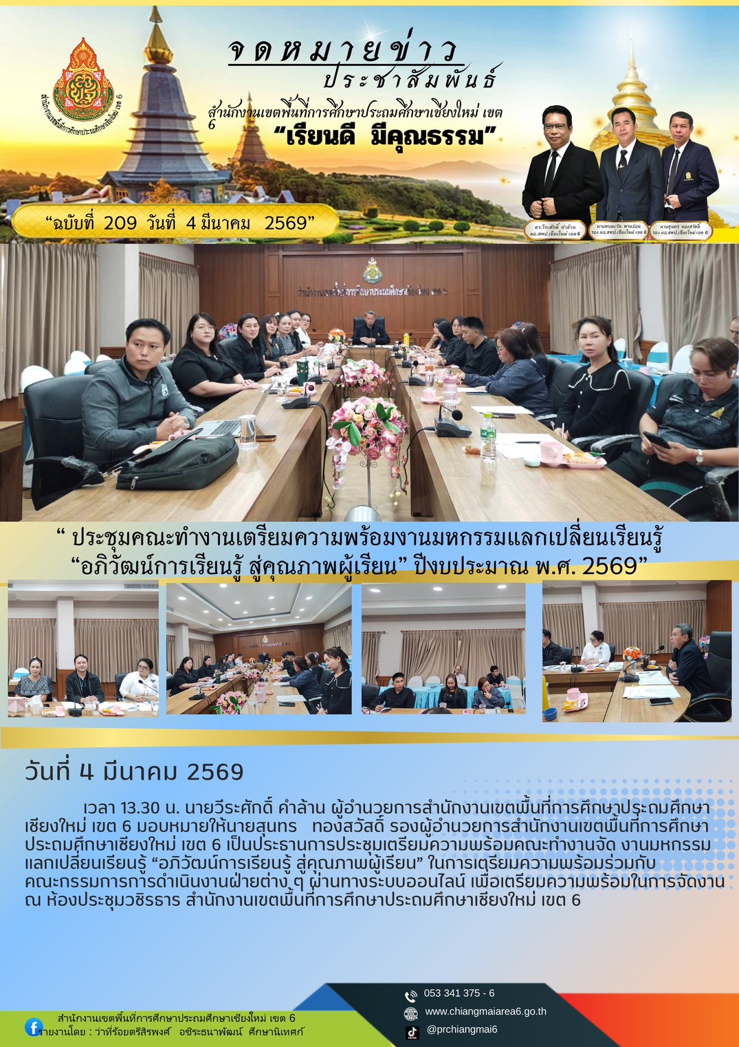 วันที่ 4 มีนาคม 2569 นายวีระศักดิ์ คำล้าน ผู้อำนวยการสำนักงานเขตพื้นที่การศึกษาประถมศึกษาเชียงใหม่ เขต 6 มอบหมายให้นายสุนทร ทองสวัสดิ์ รองผู้อำนวยการสำนักงานเขตพื้นที่การศึกษาประถมศึกษาเชียงใหม่ เขต 6 เป็นประธานประชุมเตรียมความพร้อมคณะทำงาาน จัดงานมหกรรมแลกเปลี่ยนเรียนรู้ “อภิวัฒน์การเรียนรู้ สู่คุณภาพผู้เรียน” ร่วมกับคณะกรรมการดำเนินงานฝ่ายต่าง ๆ ผ่านระบบออนไลน์ ณ ห้องประชุมวชิรธาร สพป.เชียงใหม่ เขต 6 อ.จอมทอง จ.เชียงใหม่