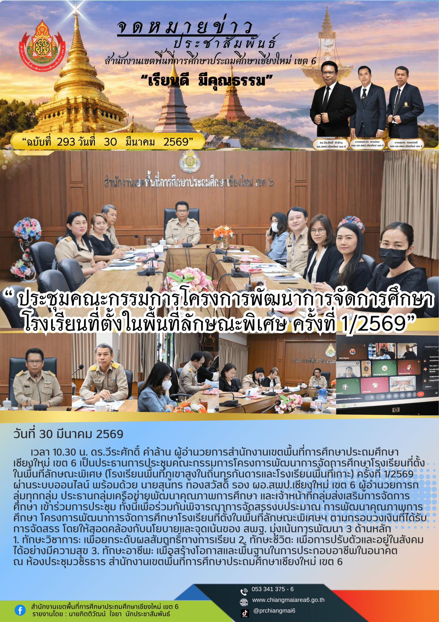 วันที่ 30 มีนาคม 2569 เวลา 10.30 น. ดร.วีระศักดิ์ คำล้าน ผู้อำนวยการสำนักงานเขตพื้นที่การศึกษาประถมศึกษาเชียงใหม่ เขต 6 เป็นประธานการประชุมคณะกรรมการโครงการพัฒนาการจัดการศึกษาโรงเรียนที่ตั้งในพื้นที่ลักษณะพิเศษ (โรงเรียนพื้นที่ภูเขาสูงในถิ่นทุรกันดารและโรงเรียนพื้นที่เกาะ) ครั้งที่ 1/2569 ผ่านระบบออนไลน์ พร้อมด้วย นายสุนทร ทองสวัสดิ์ รอง ผอ.สพป.เชียงใหม่ เขต 6 ผู้อำนวยการกลุ่มทุกกลุ่ม ประธานกลุ่มเครือข่ายพัฒนาคุณภาพการศึกษา และเจ้าหน้าที่กลุ่มส่งเสริมการจัดการศึกษา เข้าร่วมการประชุม ทั้งนี้เพื่อร่วมกันพิจารณาการจัดสรรงบประมาณ การพัฒนาคุณภาพการศึกษา โครงการพัฒนาการจัดการศึกษาโรงเรียนที่ตั้งในพื้นที่ลักษณะพิเศษฯ ตามกรอบวงเงินที่ได้รับการจัดสรร โดยให้สอดคล้องกับนโยบายและจุดเน้นของ สพฐ. มุ่งเน้นการพัฒนา 3 ด้านหลัก 1. ทักษะวิชาการ: เพื่อยกระดับผลสัมฤทธิ์ทางการเรียน 2. ทักษะชีวิต: เพื่อการปรับตัวและอยู่ในสังคมได้อย่างมีความสุข 3. ทักษะอาชีพ: เพื่อสร้างโอกาสและพื้นฐานในการประกอบอาชีพในอนาคต ณ ห้องประชุมวชิรธาร สำนักงานเขตพื้นที่การศึกษาประถมศึกษาเชียงใหม่ เขต 6