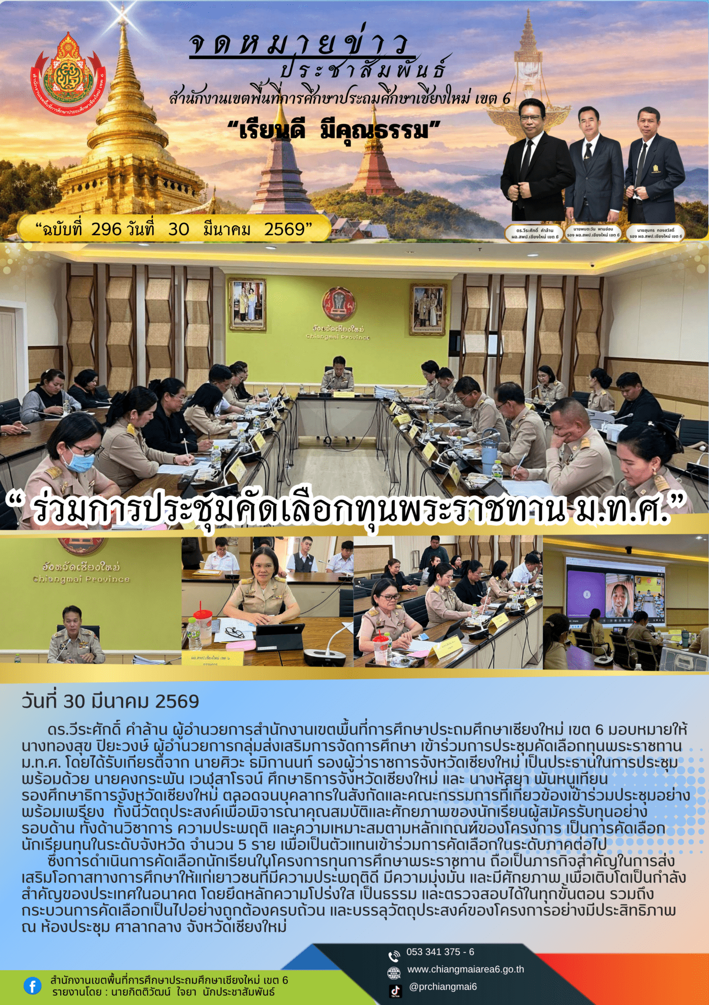 วันที่ 30 มีนาคม 2569 ดร.วีระศักดิ์ คำล้าน ผู้อำนวยการสำนักงานเขตพื้นที่การศึกษาประถมศึกษาเชียงใหม่ เขต 6 มอบหมายให้นางทองสุข ปิยะวงษ์ ผู้อำนวยการกลุ่มส่งเสริมการจัดการศึกษา เข้าร่วมการประชุมคัดเลือกทุนพระราชทาน ม.ท.ศ. โดยได้รับเกียรติจาก นายศิวะ ธมิกานนท์ รองผู้ว่าราชการจังหวัดเชียงใหม่ เป็นประธานในการประชุม พร้อมด้วย นายคงกระพัน เวฬุสาโรจน์ ศึกษาธิการจังหวัดเชียงใหม่ และ นางหัสยา พันหนูเทียน รองศึกษาธิการจังหวัดเชียงใหม่ ตลอดจนบุคลากรในสังกัดและคณะกรรมการที่เกี่ยวข้องเข้าร่วมประชุมอย่างพร้อมเพรียง