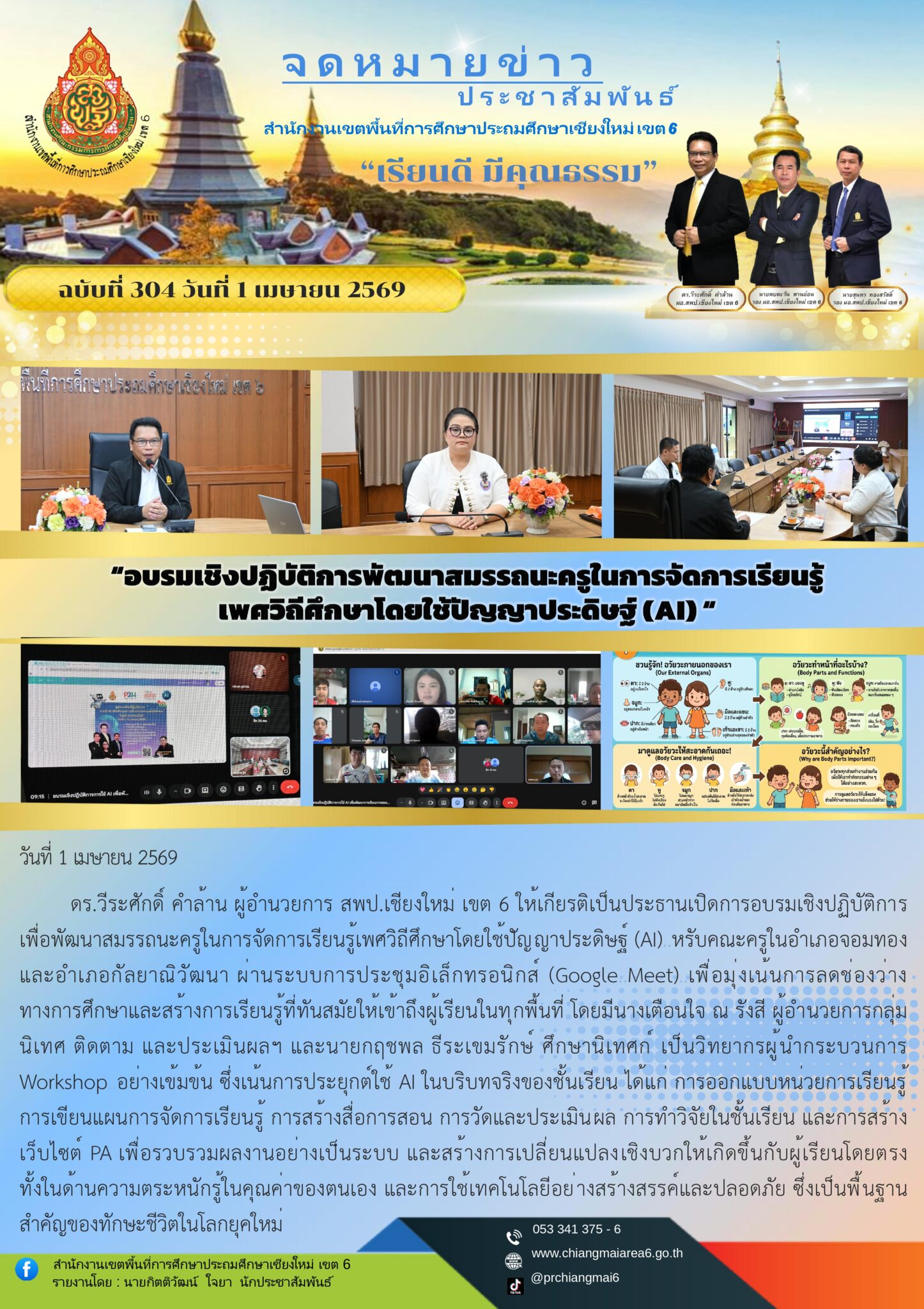 วันที่ 1 เมษายน 2569 ดร.วีระศักดิ์ คำล้าน ผู้อำนวยการ สพป.เชียงใหม่ เขต 6 ให้เกียรติเป็นประธานเปิดการอบรมเชิงปฏิบัติการ เพื่อพัฒนาสมรรถนะครูในการจัดการเรียนรู้เพศวิถีศึกษาโดยใช้ปัญญาประดิษฐ์ (AI) สำหรับคณะครูในอำเภอจอมทอง และอำเภอกัลยาณิวัฒนา ผ่านระบบการประชุมอิเล็กทรอนิกส์ (Google Meet) เพื่อมุ่งเน้นการลดช่องว่างทางการศึกษาและสร้างการเรียนรู้ที่ทันสมัยให้เข้าถึงผู้เรียนในทุกพื้นที่ โดยมีนางเตือนใจ ณ รังสี ผู้อำนวยการกลุ่มนิเทศ ติดตาม และประเมินผลฯ และนายกฤชพล ธีระเขมรักษ์ ศึกษานิเทศก์ เป็นวิทยากรผู้นำกระบวนการ Workshop อย่างเข้มข้น ซึ่งเน้นการประยุกต์ใช้ AI ในบริบทจริงของชั้นเรียน ได้แก่ การออกแบบหน่วยการเรียนรู้ การเขียนแผนการจัดการเรียนรู้ การสร้างสื่อการสอน การวัดและประเมินผล การทำวิจัยในชั้นเรียน และการสร้างเว็บไซต์ PA เพื่อรวบรวมผลงานอย่างเป็นระบบ และสร้างการเปลี่ยนแปลงเชิงบวกให้เกิดขึ้นกับผู้เรียนโดยตรง ทั้งในด้านความตระหนักรู้ในคุณค่าของตนเอง และการใช้เทคโนโลยีอย่างสร้างสรรค์และปลอดภัย ซึ่งเป็นพื้นฐานสำคัญของทักษะชีวิตในโลกยุคใหม