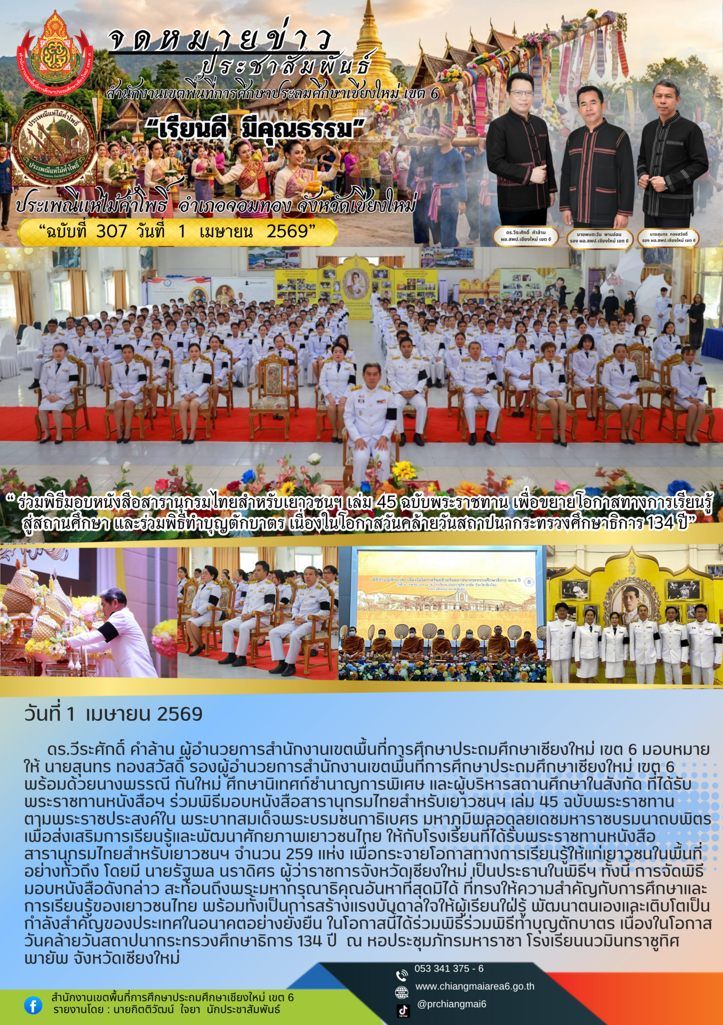 วันที่ 1 เมษายน 2569 ดร.วีระศักดิ์ คำล้าน ผู้อำนวยการสำนักงานเขตพื้นที่การศึกษาประถมศึกษาเชียงใหม่ เขต 6 มอบหมายให้ นายสุนทร ทองสวัสดิ์ รองผู้อำนวยการสำนักงานเขตพื้นที่การศึกษาประถมศึกษาเชียงใหม่ เขต 6 พร้อมด้วยนางพรรณี กันใหม่ ศึกษานิเทศก์ชำนาญการพิเศษ และผู้บริหารสถานศึกษาในสังกัด ที่ได้รับพระราชทานหนังสือฯ ร่วมพิธีมอบหนังสือสารานุกรมไทยสำหรับเยาวชนฯ เล่ม 45 ฉบับพระราชทาน ตามพระราชประสงค์ใน พระบาทสมเด็จพระบรมชนกาธิเบศร มหาภูมิพลอดุลยเดชมหาราชบรมนาถบพิตร เพื่อส่งเสริมการเรียนรู้และพัฒนาศักยภาพเยาวชนไทย ให้กับโรงเรียนที่ได้รับพระราชทานหนังสือสารานุกรมไทยสำหรับเยาวชนฯ จำนวน 259 แห่ง เพื่อกระจายโอกาสทางการเรียนรู้ให้แก่เยาวชนในพื้นที่อย่างทั่วถึง โดยมี นายรัฐพล นราดิศร ผู้ว่าราชการจังหวัดเชียงใหม่ เป็นประธานในพิธีฯ ทั้งนี้ การจัดพิธีมอบหนังสือดังกล่าว สะท้อนถึงพระมหากรุณาธิคุณอันหาที่สุดมิได้ ที่ทรงให้ความสำคัญกับการศึกษาและการเรียนรู้ของเยาวชนไทย พร้อมทั้งเป็นการสร้างแรงบันดาลใจให้ผู้เรียนใฝ่รู้ พัฒนาตนเองและเติบโตเป็นกำลังสำคัญของประเทศในอนาคตอย่างยั่งยืน ในโอกาสนี้ได้ร่วมพิธีร่วมพิธีทำบุญตักบาตร เนื่องในโอกาสวันคล้ายวันสถาปนากระทรวงศึกษาธิการ 134 ปี ณ หอประชุมภัทรมหาราชา โรงเรียนนวมินทราชูทิศ พายัพ จังหวัดเชียงใหม่