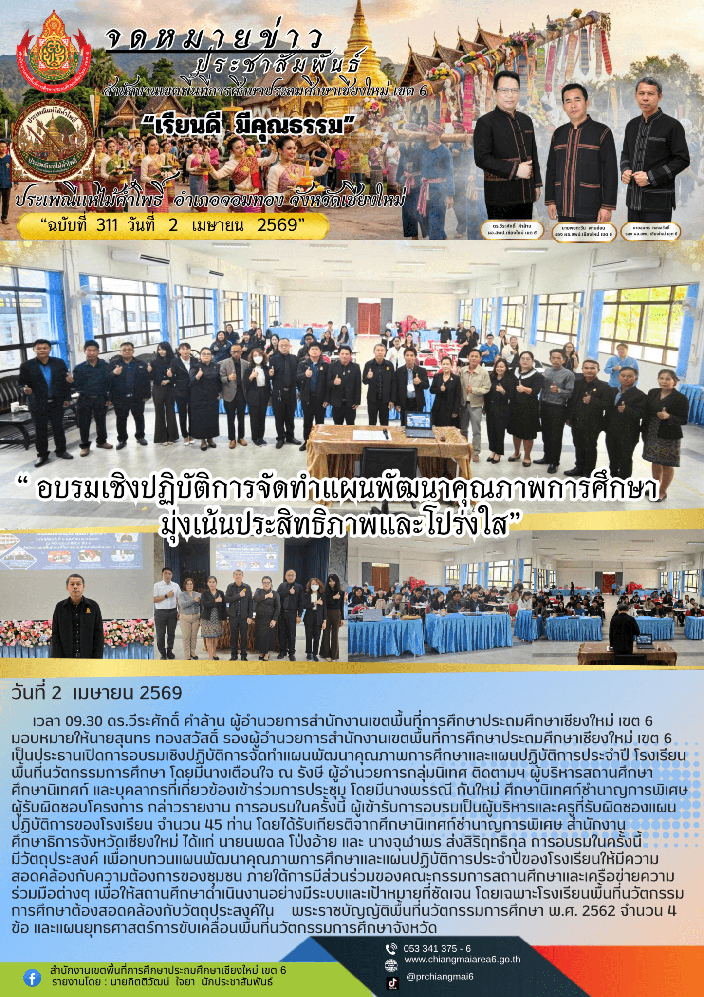 วันที่ 2 เมษายน 2569 เวลา 09.30 ดร.วีระศักดิ์ คำล้าน ผู้อำนวยการสำนักงานเขตพื้นที่การศึกษาประถมศึกษาเชียงใหม่ เขต 6 มอบหมายให้นายสุนทร ทองสวัสดิ์ รองผู้อำนวยการสำนักงานเขตพื้นที่การศึกษาประถมศึกษาเชียงใหม่ เขต เป็นประธานเปิดการอบรมเชิงปฏิบัติการจัดทำแผนพัฒนาคุณภาพการศึกษาและแผนปฏิบัติการประจำปี โรงเรียนพื้นที่นวัตกรรมการศึกษา โดยมีนางเตือนใจ ณ รังษี ผู้อำนวยการกลุ่มนิเทศ ติดตามฯ ผู้บริหารสถานศึกษา ศึกษานิเทศก์ และบุคลากรที่เกี่ยวข้องเข้าร่วมการประชุม โดยมีนางพรรณี กันใหม่ ศึกษานิเทศก์ชำนาญการพิเศษ ผู้รับผิดชอบโครงการ กล่าวรายงาน การอบรมในครั้งนี้ ผู้เข้ารับการอบรมเป็นผู้บริหารและครูที่รับผิดชองแผนปฏิบัติการของโรงเรียน จำนวน 45 ท่าน โดยได้รับเกียรติจากศึกษานิเทศก์ชำนาญการพิเศษ สำนักงานศึกษาธิการจังหวัดเชียงใหม่ ได้แก่ นายนพดล โป่งอ้ายและ นางจุฬาพร ส่งสิริฤทธิกุล การอบรมในครั้งนี้ มีวัตถุประสงค์ เพื่อทบทวนแผนพัฒนาคุณภาพการศึกษาและแผนปฏิบัติการประจำปีปีของโรงเรียนให้มีความสอดคล้องกับความต้องการของชุมชน ภายใต้การมีส่วนร่วมของคณะกรรมการสถานศึกษาและเครือข่ายความร่วมมือต่างๆ เพื่อให้สถานศึกษาดำเนินงานอย่างมีระบบและเป้าหมายที่ชัดเจน โดยเฉพาะโรงเรียนพื้นที่นวัตกรรมการศึกษาต้องสอดคล้องกับวัตถุประสงค์ในพระราชบัญญัติพื้นที่นวัตกรรมการศึกษา พ.ศ. 2562 จำนวน 4 ข้อ และแผนยุทธศาสตร์การขับเคลื่อนพื้นที่นวัตกรรมการศึกษาจังหวัด