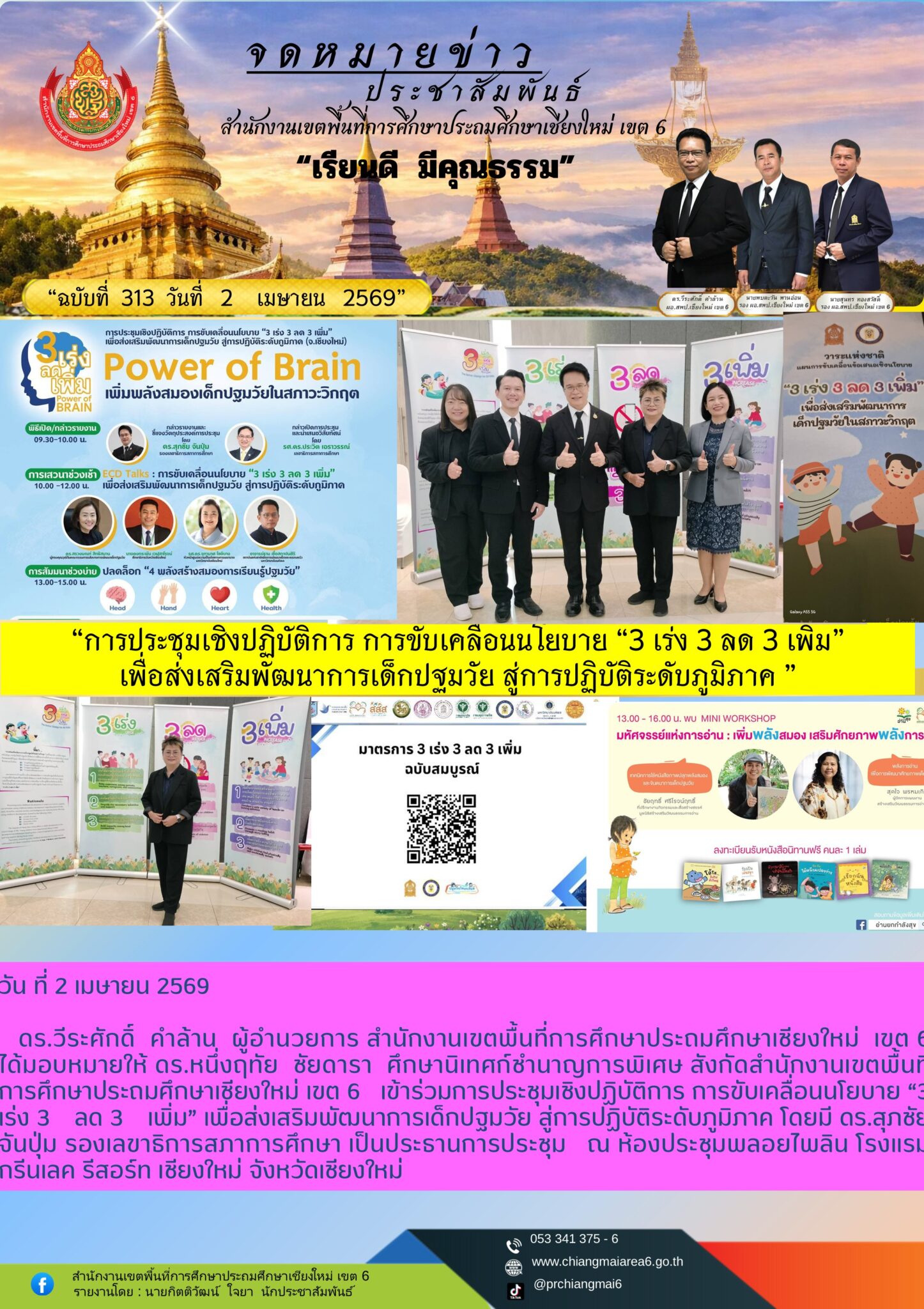 วันที่ 2 มีนาคม 2569 ดร.วีระศักดิ์ คำล้าน ผู้อำนวยการสำนักงานเขตพื้นที่การศึกษาประถมศึกษาเชียงใหม่ เขต 6 มอบหมายให้ ดร.หนึ่งฤทัย ชัยดารา ศึกษานิเทศก์ชำนาญการพิเศษ สังกัดสำนักงานเขตพื้นที่การศึกษาประถมศึกษาเชียงใหม่ เขต 6 เข้าร่วมการประชุมเชิงปฏิบัติการ การขับเคลื่อนนโยบาย 3 ลด 3 เพิ่ม” ส่งเสริมพัฒนาการเด็กปฐมวัย สู่การปฏิบัติระดับภูมิภาค โดยมี ดร.สุภชัย จันปุ่ม รองเลขาธิการสภาการศึกษา เป็นประธานการประชุม ณ ห้องประชุมพลอยไพลิน โรงแรมกรีนเลค รีสอร์ท เชียงใหม่ จังหวัดเชียงใหม่