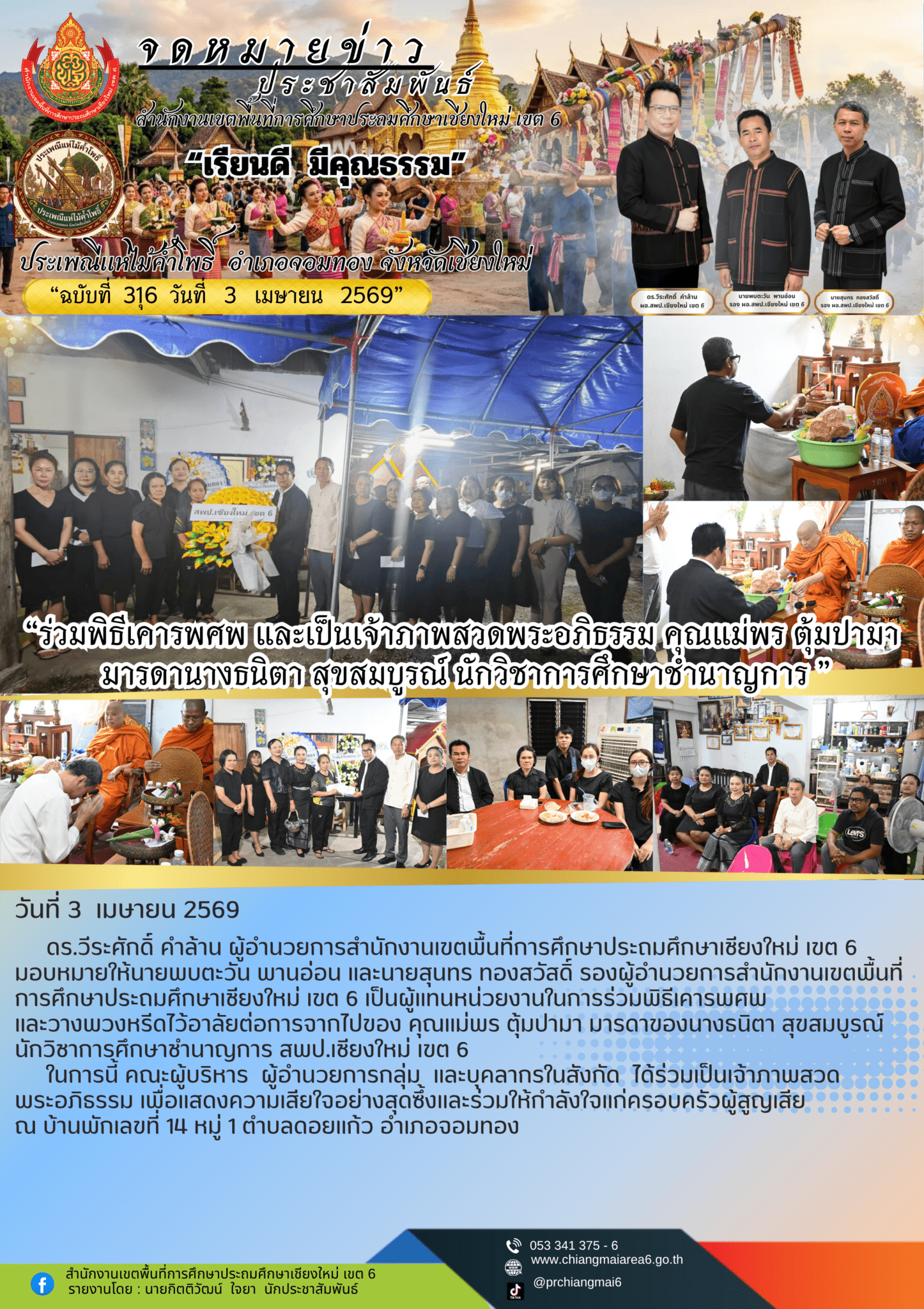 วันที่ 3 มีนาคม 2569 ดร.วีระศักดิ์ คำล้าน ผู้อำนวยการสำนักงานเขตพื้นที่การศึกษาประถมศึกษาเชียงใหม่ เขต 6 มอบหมายให้นายพบตะวัน พานอ่อน และนายสุนทร ทองสวัสดิ์ รองผู้อำนวยการสำนักงานเขตพื้นที่การศึกษาประถมศึกษาเชียงใหม่ เขต 6 เป็นผู้แทนหน่วยงานในการร่วมพิธีเคารพศพ และวางพวงหรีดไว้อาลัยต่อการจากไปของ คุณแม่พร ตุ้มปามา มารดาของนางธนิตา สุขสมบูรณ์ นักวิชาการศึกษาชำนาญการ สพป.เชียงใหม่ เขต 6 ในการนี้ คณะผู้บริหาร ผู้อำนวยการกลุ่ม และบุคลากรในสังกัด ได้ร่วมเป็นเจ้าภาพสวดพระอภิธรรม เพื่อแสดงความเสียใจอย่างสุดซึ้งและร่วมให้กำลังใจแก่ครอบครัวผู้สูญเสีย ณ บ้านพักเลขที่ 14 หมู่ 1 ตำบลดอยแก้ว อำเภอจอมทอง จังหวัดเชียงใหม่