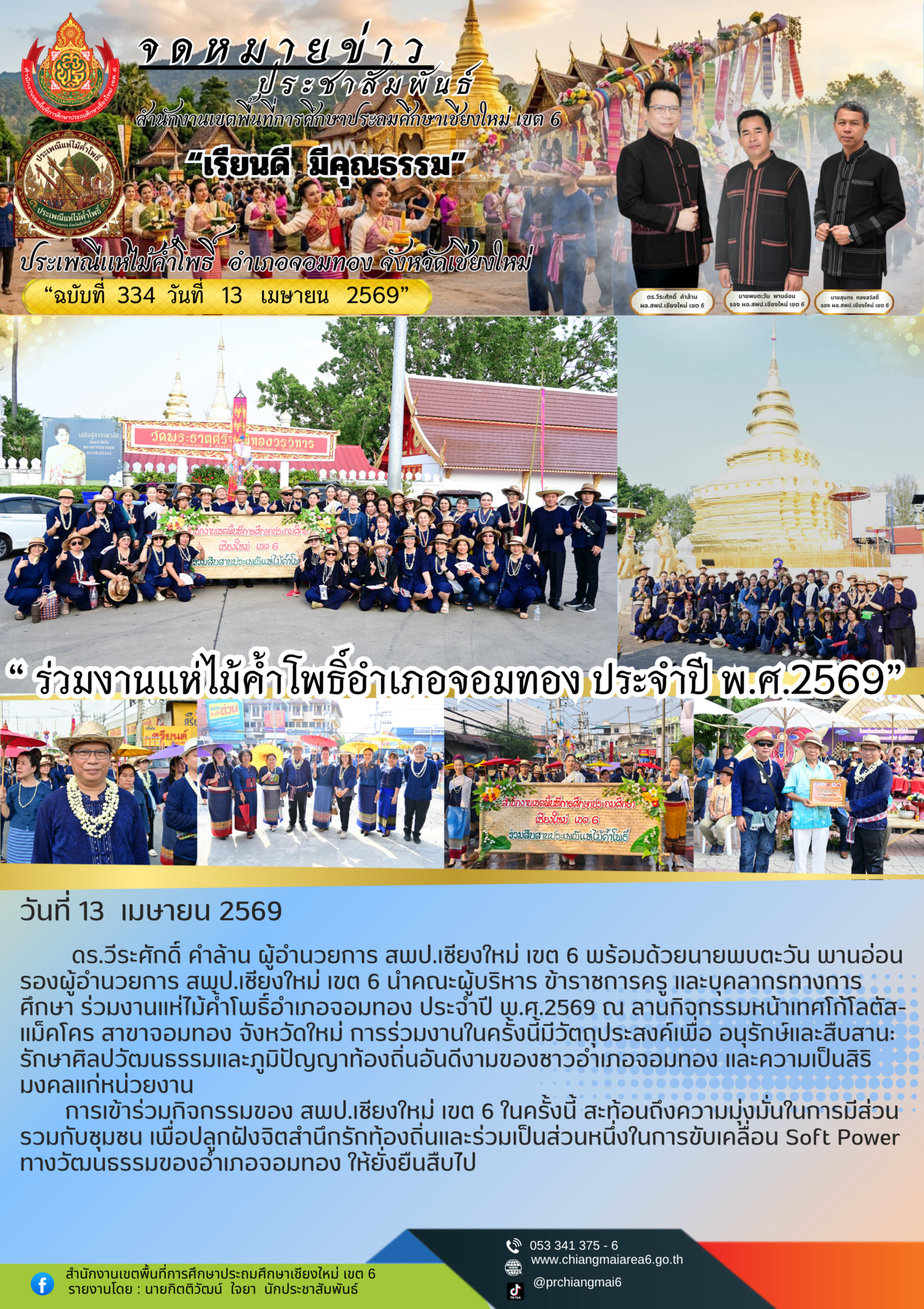 วันที่ 13 เมษายน 2568 ดร.วีระศักดิ์ คำล้าน ผู้อำนวยการ สพป.เชียงใหม่ เขต 6 พร้อมด้วยนายพบตะวัน พานอ่อน รองผู้อำนวยการ สพป.เชียงใหม่ เขต 6 นำคณะผู้บริหาร ข้าราชการครู และบุคลากรทางการศึกษา ร่วมงานแห่ไม้ค้ำโพธิ์อำเภอจอมทอง ประจำปี พ.ศ.2569 ณ ลานกิจกรรมหน้าเทศโก้โลตัส-แม็คโคร สาขาจอมทอง จังหวัดใหม่ การร่วมงานในครั้งนี้มีวัตถุประสงค์เพื่อ อนุรักษ์และสืบสาน: รักษาศิลปวัฒนธรรมและภูมิปัญญาท้องถิ่นอันดีงามของชาวอำเภอจอมทอง และความเป็นสิริมงคลแก่หน่วยงาน