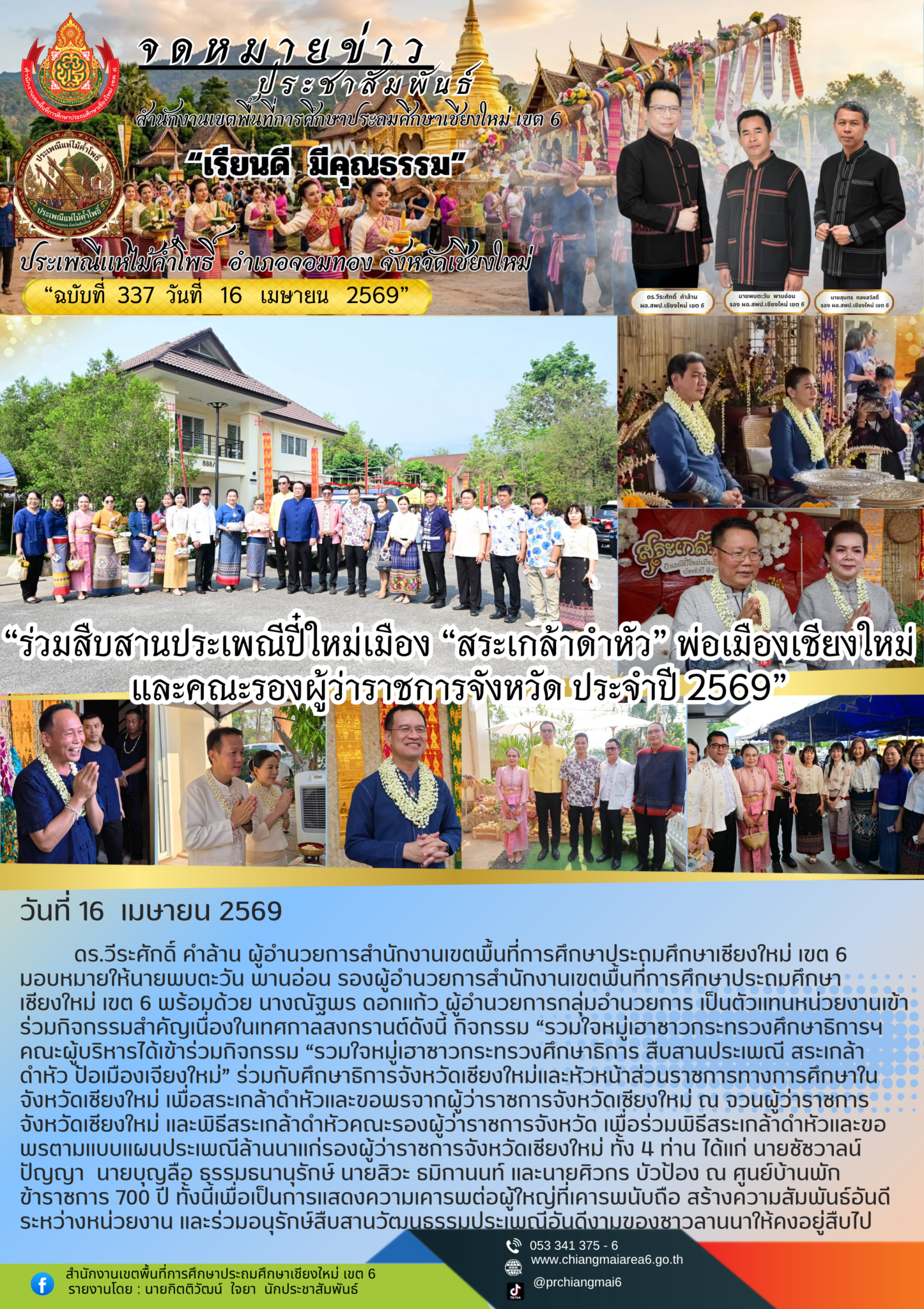 วันที่ 16 เมษายน 2569 ดร.วีระศักดิ์ คำล้าน ผู้อำนวยการสำนักงานเขตพื้นที่การศึกษาประถมศึกษาเชียงใหม่ เขต 6 มอบหมายให้นายพบตะวัน พานอ่อน รองผู้อำนวยการสำนักงานเขตพื้นที่การศึกษาประถมศึกษาเชียงใหม่ เขต 6 พร้อมด้วย นางณัฐพร ดอกแก้ว ผู้อำนวยการกลุ่มอำนวยการ เป็นตัวแทนหน่วยงานเข้าร่วมกิจกรรมสำคัญเนื่องในเทศกาลสงกรานต์ดังนี้ กิจกรรม “รวมใจหมู่เฮาชาวกระทรวงศึกษาธิการฯ คณะผู้บริหารได้เข้าร่วมกิจกรรม “รวมใจหมู่เฮาชาวกระทรวงศึกษาธิการ สืบสานประเพณี สระเกล้าดำหัว ป้อเมืองเจียงใหม่” ร่วมกับศึกษาธิการจังหวัดเชียงใหม่และหัวหน้าส่วนราชการทางการศึกษาในจังหวัดเชียงใหม่ เพื่อสระเกล้าดำหัวและขอพรจากผู้ว่าราชการจังหวัดเชียงใหม่ ณ จวนผู้ว่าราชการจังหวัดเชียงใหม่ และพิธีสระเกล้าดำหัวคณะรองผู้ว่าราชการจังหวัด เพื่อร่วมพิธีสระเกล้าดำหัวและขอพรตามแบบแผนประเพณีล้านนาแก่รองผู้ว่าราชการจังหวัดเชียงใหม่ ทั้ง 4 ท่าน ได้แก่ นายชัชวาลน์ ปัญญา นายบุญลือ ธรรมธนานุรักษ์ นายสิวะ ธมิกานนท์ และนายศิวกร บัวป้อง ณ ศูนย์บ้านพักข้าราชการ 700 ปี ทั้งนี้เพื่อเป็นการแสดงความเคารพต่อผู้ใหญ่ที่เคารพนับถือ สร้างความสัมพันธ์อันดีระหว่างหน่วยงาน และร่วมอนุรักษ์สืบสานวัฒนธรรมประเพณีอันดีงามของชาวลานนาให้คงอยู่สืบไป