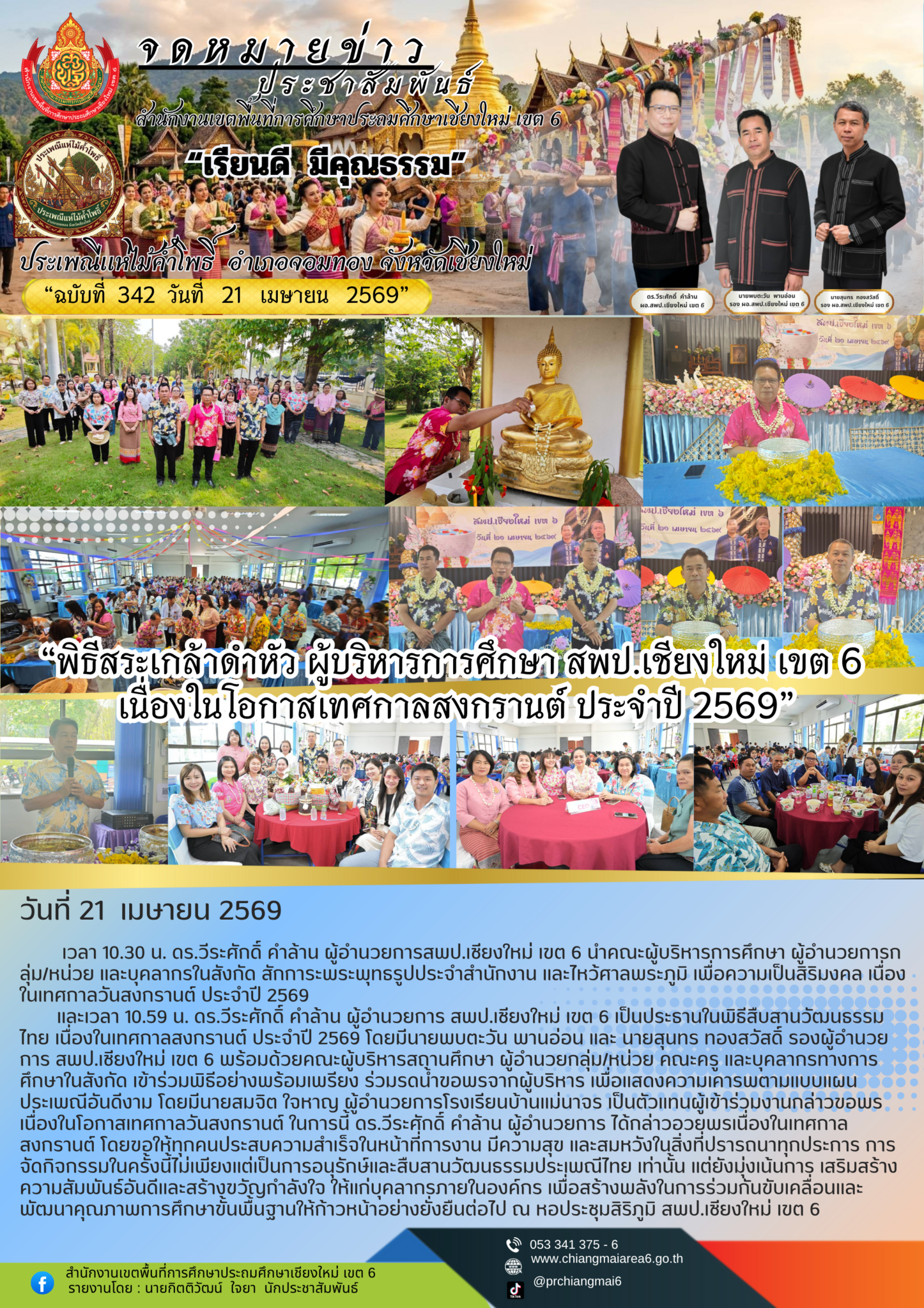 และเวลา 10.59 น. ดร.วีระศักดิ์ คำล้าน ผู้อำนวยการ สพป.เชียงใหม่ เขต 6 เป็นประธานในพิธีสืบสานวัฒนธรรมไทย เนื่องในเทศกาลสงกรานต์ ประจำปี 2569 โดยมีนายพบตะวัน พานอ่อน และ นายสุนทร ทองสวัสดิ์ รองผู้อำนวยการ สพป.เชียงใหม่ เขต 6 พร้อมด้วยคณะผู้บริหารสถานศึกษา ผู้อำนวยกลุ่ม/หน่วย คณะครู และบุคลากรทางการศึกษาในสังกัด เข้าร่วมพิธีอย่างพร้อมเพรียง ร่วมรดน้ำขอพรจากผู้บริหาร เพื่อแสดงความเคารพตามแบบแผนประเพณีอันดีงาม โดยมีนายสมจิต ใจหาญ ผู้อำนวยการโรงเรียนบ้านแม่นาจร เป็นตัวแทนผู้เข้าร่วมงานกล่าวขอพร เนื่องในโอกาสเทศกาลวันสงกรานต์ ในการนี้ ดร.วีระศักดิ์ คำล้าน ผู้อำนวยการ ได้กล่าวอวยพรเนื่องในเทศกาลสงกรานต์ โดยขอให้ทุกคนประสบความสำเร็จในหน้าที่การงาน มีความสุข และสมหวังในสิ่งที่ปรารถนาทุกประการ การจัดกิจกรรมในครั้งนี้ไม่เพียงแต่เป็นการอนุรักษ์และสืบสานวัฒนธรรมประเพณีไทย เท่านั้น แต่ยังมุ่งเน้นการ เสริมสร้างความสัมพันธ์อันดีและสร้างขวัญกำลังใจ ให้แก่บุคลากรภายในองค์กร เพื่อสร้างพลังในการร่วมกันขับเคลื่อนและพัฒนาคุณภาพการศึกษาขั้นพื้นฐานให้ก้าวหน้าอย่างยั่งยืนต่อไป ณ หอประชุมสิริภูมิ สพป.เชียงใหม่ เขต 6