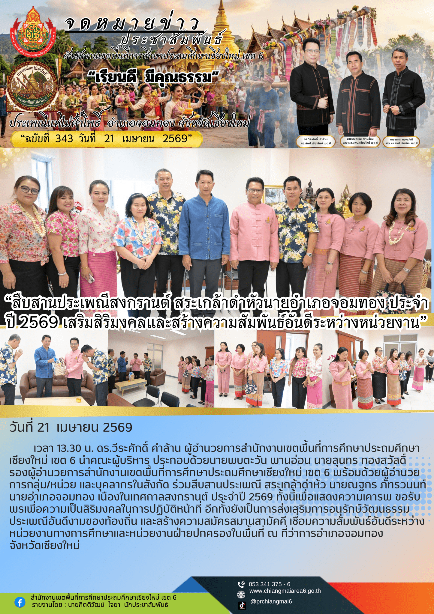 วันที่ 21 เมษายน 2569 เวลา 13.30 น. ดร.วีระศักดิ์ คำล้าน ผู้อำนวยการสำนักงานเขตพื้นที่การศึกษาประถมศึกษาเชียงใหม่ เขต 6 นำคณะผู้บริหาร ประกอบด้วยนายพบตะวัน พานอ่อน นายสุนทร ทองสวัสดิ์ รองผู้อำนวยการสำนักงานเขตพื้นที่การศึกษาประถมศึกษาเชียงใหม่ เขต 6 พร้อมด้วยผู้อำนวยการกลุ่ม/หน่วย และบุคลากรในสังกัด ร่วมสืบสานประเพณี สระเกล้าดำห้ว นายณฐกร ภัทรวนนท์ นายอำเภอจอมทอง เนืองในเทศกาลสงกรานต์ ประจำปี 2569 ทั้งนี้เพื่อแสดงความเคารพ ขอรับพรเพื่อความเป็นสิริมงคลในการปฏิบัติหน้าที่ อีกทั้งยังเป็นการส่งเสริมการอนุรักษ์วัฒนธรรมประเพณีอันดีงามของท้องถิ่น และสร้างความสมัครสมานสามัคคี เชื่อมความสัมพันธ์อันดีระหว่างหน่วยงานทางการศึกษาและหน่วยงานฝ่ายปกครองในพื้นที่ ณ ที่ว่าการอำเภอจอมทอง จังหวัดเชียงใหม่