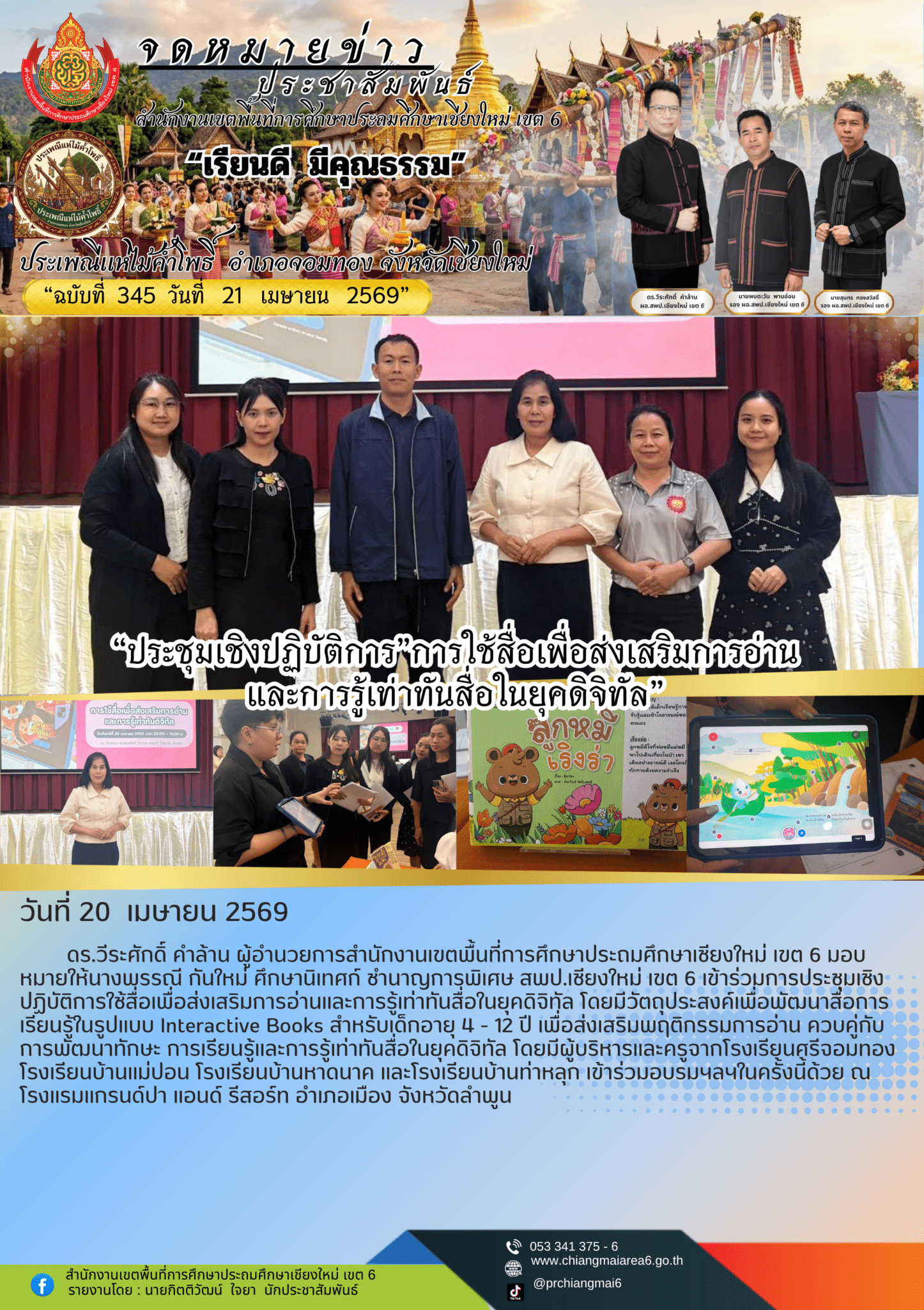 วันที่ 20 เมษายน 2569 ดร.วีระศักดิ์ คำล้าน ผู้อำนวยการสำนักงานเขตพื้นที่การศึกษาประถมศึกษาเชียงใหม่ เขต 6 มอบหมายให้นางพรรณี กันใหม่ ศึกษานิเทศก์ ชำนาญการพิเศษ สพป.เชียงใหม่ เขต 6 เข้าร่วมการประชุมเชิงปฏิบัติการใช้สื่อเพื่อส่งเสริมการอ่านและการรู้เท่าทันสื่อในยุคดิจิทัล โดยมีวัตถุประสงค์เพื่อพัฒนาสื่อการเรียนรู้ในรูปแบบ Interactive Books สำหรับเด็กอายุ 4 – 12 ปี เพื่อส่งเสริมพฤติกรรมการอ่าน ควบคู่กับการพัฒนาทักษะ การเรียนรู้และการรู้เท่าทันสื่อในยุคดิจิทัล โดยมีผู้บริหารและครูจากโรงเรียนศรีจอมทอง โรงเรียนบ้านแม่ปอน โรงเรียนบ้านหาดนาค และโรงเรียนบ้านท่าหลุก เข้าร่วมอบรมฯลฯในครั้งนี้ด้วย ณ โรงแรมแกรนด์ปา แอนด์ รีสอร์ท อำเภอเมือง จังหวัดลำพูน