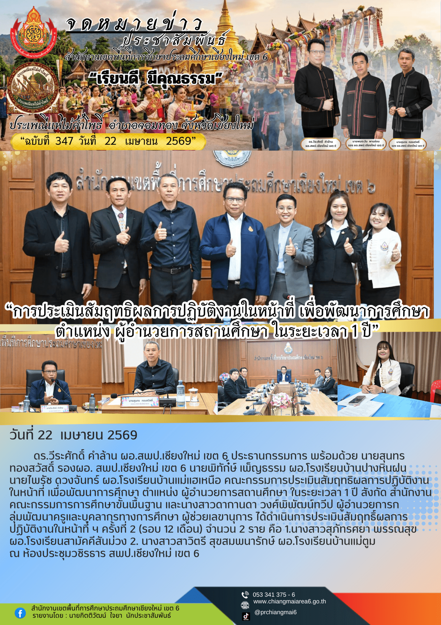 วันที่ 22 เมษายน 2569 ดร.วีระศักดิ์ คำล้าน ผอ.สพป.เชียงใหม่ เขต 6 ประธานกรรมการ พร้อมด้วย นายสุนทร ทองสวัสดิ์ รองผอ. สพป.เชียงใหม่ เขต 6 นายพิทัก๋์ษ์ เพ็ญธรรม ผอ.โรงเรียนบ้านปางหินฝน นายไพรัช ดวงจันทร์ ผอ.โรงเรียนบ้านแม่แฮเหนือ คณะกรรมการประเมินสัมฤทธิผลการปฏิบัติงานในหน้าที่ เพื่อพัฒนาการศึกษา ตำแหน่ง ผู้อำนวยการสถานศึกษา ในระยะเวลา 1 ปี สังกัด สำนักงานคณะกรรมการการศึกษาขั้นพื้นฐาน และนางสาวดากานดา วงศ์พิพัฒน์ทวีป ผู้อำนวยการกลุ่มพัฒนาครูและบุคลากรทางการศึกษา ผู้ช่วยเลขานุการ ได้ดำเนินการประเมินสัมฤทธิ์ผลการปฏิบัติงานในหน้าที่ ฯ ครั้งที่ 2 (รอบ 12 เดือน) จำนวน 2 ราย คือ 1.นางสาวสุภัทรศยา พรรณสุข ผอ.โรงเรียนสามัคคีสันม่วง 2. นางสาวสาวิตรี สุขสมพนารักษ์ ผอ.โรงเรียนบ้านแม่ตูม ณ ห้องประชุมวชิรธาร สพป.เชียงใหม่ เขต 6