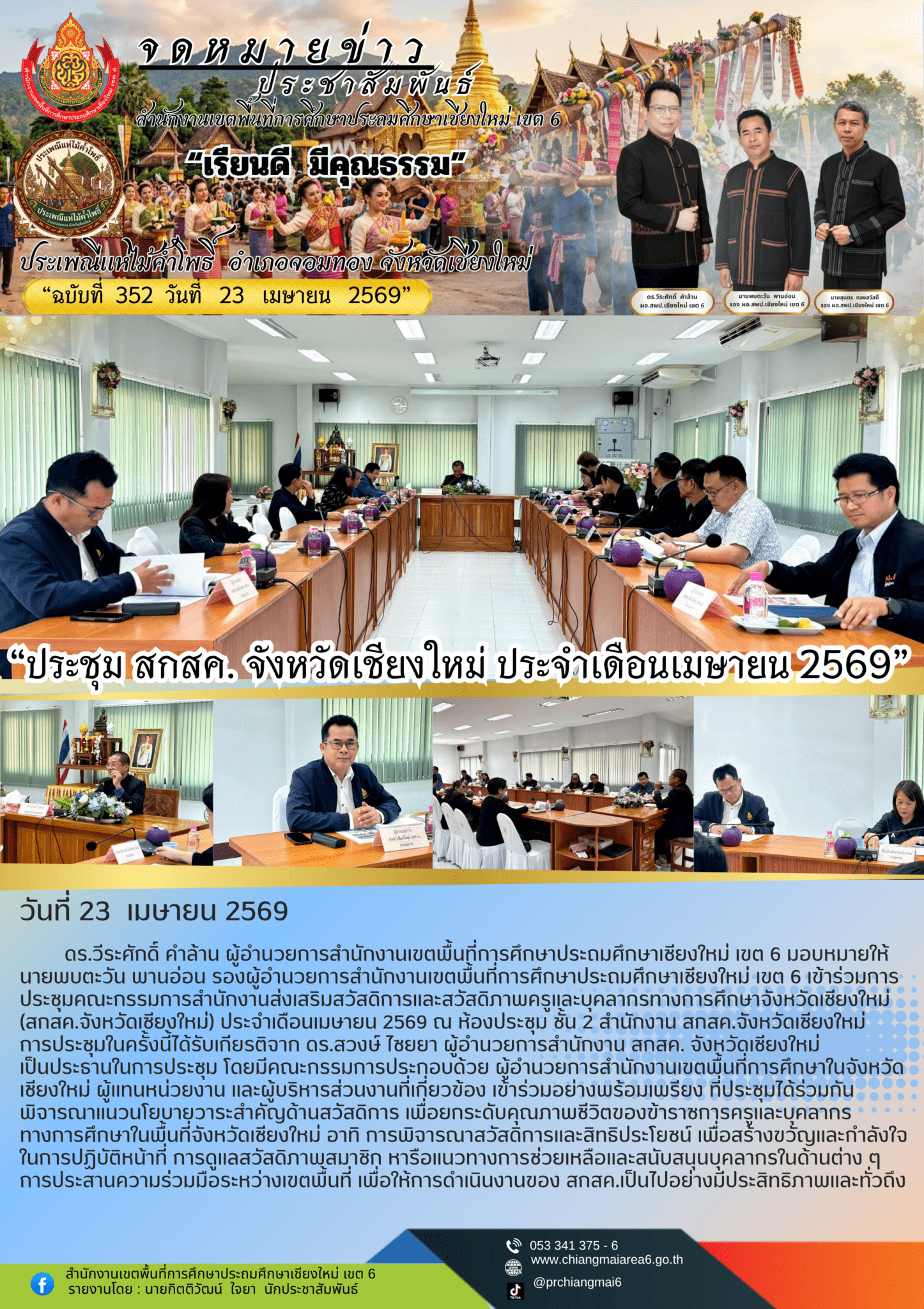 วันที่ 23 เมษายน 2569 ดร.วีระศักดิ์ คำล้าน ผู้อำนวยการสำนักงานเขตพื้นที่การศึกษาประถมศึกษาเชียงใหม่ เขต 6 มอบหมายให้นายพบตะวัน พานอ่อน รองผู้อำนวยการสำนักงานเขตพื้นที่การศึกษาประถมศึกษาเชียงใหม่ เขต 6 เข้าร่วมการประชุมคณะกรรมการสำนักงานส่งเสริมสวัสดิการและสวัสดิภาพครูและบุคลากรทางการศึกษาจังหวัดเชียงใหม่ (สกสค.จังหวัดเชียงใหม่) ประจำเดือนเมษายน 2569 ณ ห้องประชุม ชั้น 2 สำนักงาน สกสค.จังหวัดเชียงใหม่ การประชุมในครั้งนี้ได้รับเกียรติจาก ดร.สวงษ์ ไชยยา ผู้อำนวยการสำนักงาน สกสค. จังหวัดเชียงใหม่ เป็นประธานในการประชุม โดยมีคณะกรรมการประกอบด้วย ผู้อำนวยการสำนักงานเขตพื้นที่การศึกษาในจังหวัดเชียงใหม่ ผู้แทนหน่วยงาน และผู้บริหารส่วนงานที่เกี่ยวข้อง เข้าร่วมอย่างพร้อมเพรียง ที่ประชุมได้ร่วมกันพิจารณาแนวนโยบายวาระสำคัญด้านสวัสดิการ เพื่อยกระดับคุณภาพชีวิตของข้าราชการครูและบุคลากรทางการศึกษาในพื้นที่จังหวัดเชียงใหม่ อาทิ การพิจารณาสวัสดิการและสิทธิประโยชน์ เพื่อสร้างขวัญและกำลังใจในการปฏิบัติหน้าที่ การดูแลสวัสดิภาพสมาชิก หารือแนวทางการช่วยเหลือและสนับสนุนบุคลากรในด้านต่าง ๆ การประสานความร่วมมือระหว่างเขตพื้นที่ เพื่อให้การดำเนินงานของ สกสค.เป็นไปอย่างมีประสิทธิภาพและทั่วถึง