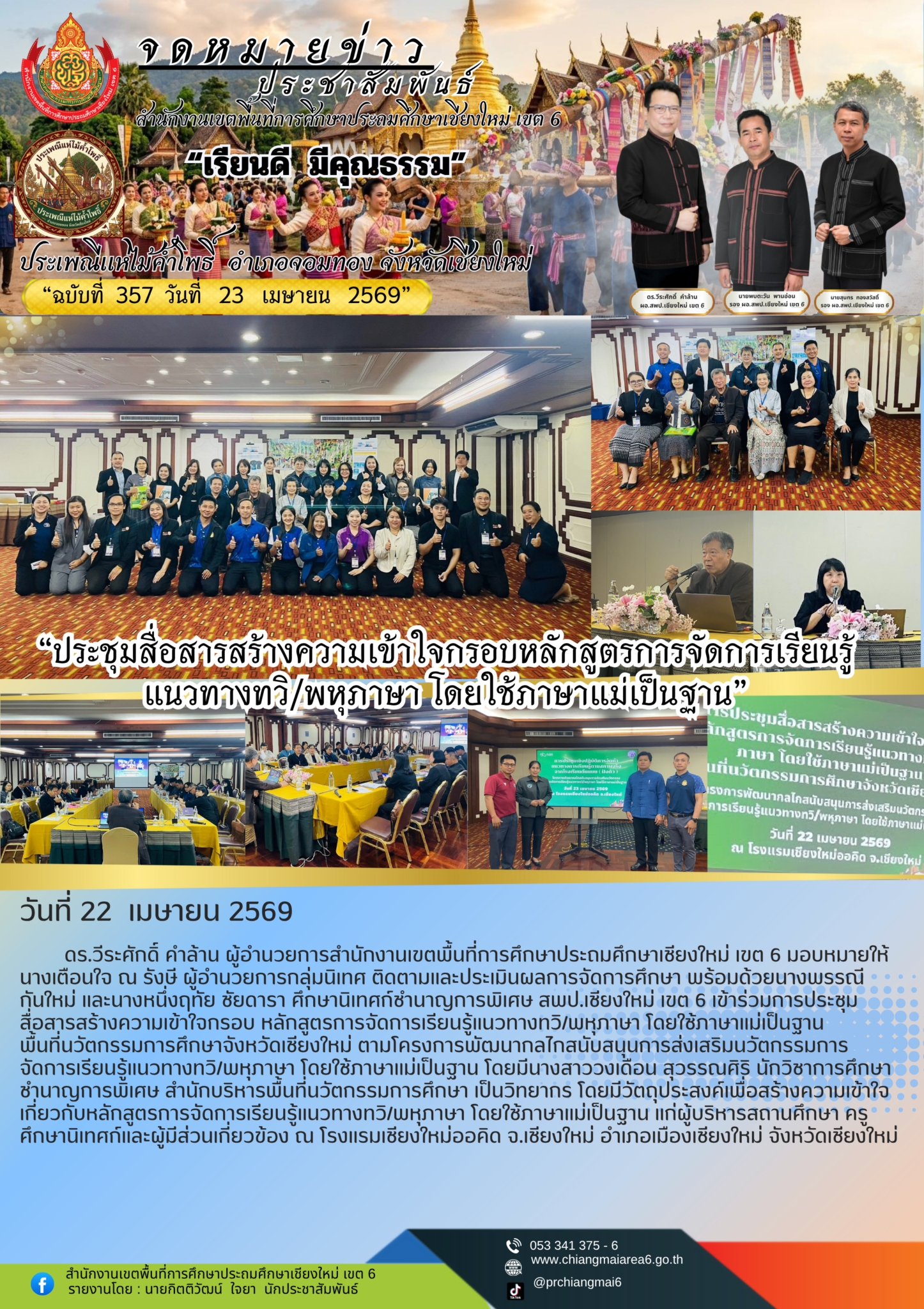 วันที่ 22 เมษายน 2569 ดร.วีระศักดิ์ คำล้าน ผู้อำนวยการสำนักงานเขตพื้นที่การศึกษาประถมศึกษาเชียงใหม่ เขต 6 มอบหมายให้นางเตือนใจ ณ รังษี ผู้อำนวยการกลุ่มนิเทศ ติดตามและประเมินผลการจัดการศึกษา พร้อมด้วยนางพรรณี กันใหม่ และนางหนึ่งฤทัย ชัยดารา ศึกษานิเทศก์ชำนาญการพิเศษ สพป.เชียงใหม่ เขต 6 เข้าร่วมการประชุมสื่อสารสร้างความเข้าใจกรอบ หลักสูตรการจัดการเรียนรู้แนวทางทวิ/พหุภาษา โดยใช้ภาษาแม่เป็นฐาน พื้นที่นวัตกรรมการศึกษาจังหวัดเชียงใหม่ ตามโครงการพัฒนากลไกสนับสนุนการส่งเสริมนวัตกรรมการ จัดการเรียนรู้แนวทางทวิ/พหุภาษา โดยใช้ภาษาแม่เป็นฐาน โดยมีนางสาววงเดือน สุวรรณศิริ นักวิชาการศึกษาชำนาญการพิเศษ สำนักบริหารพื้นที่นวัตกรรมการศึกษา เป็นวิทยากร โดยมีวัตถุประสงค์เพื่อสร้างความเข้าใจเกี่ยวกับหลักสูตรการจัดการเรียนรู้แนวทางทวิ/พหุภาษา โดยใช้ภาษาแม่เป็นฐาน แก่ผู้บริหารสถานศึกษา ครู ศึกษานิเทศก์และผู้มีส่วนเกี่ยวข้อง ณ โรงแรมเชียงใหม่ออคิด จ.เชียงใหม่ อำเภอเมืองเชียงใหม่ จังหวัดเชียงใหม่
