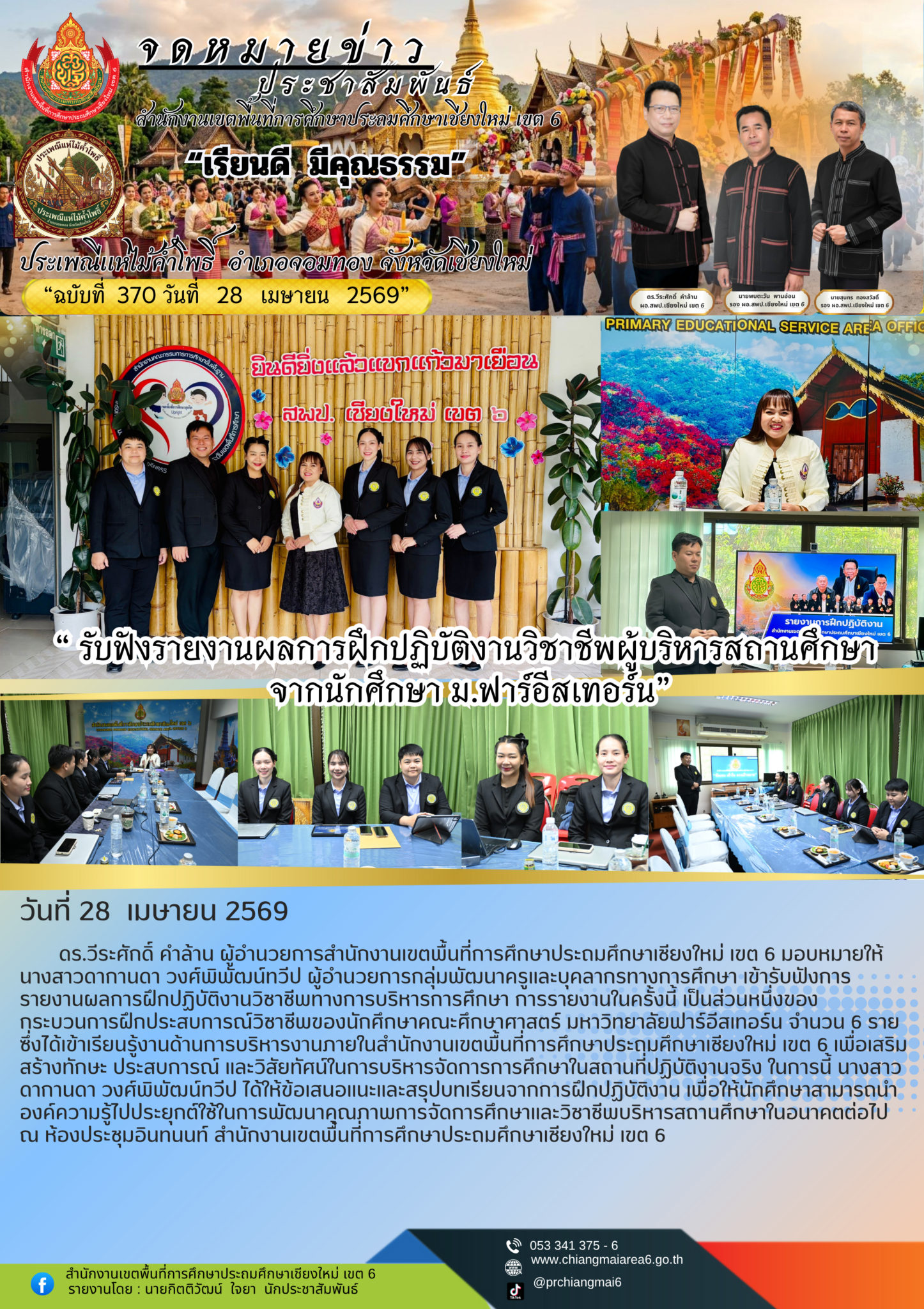 วันที่ 28 เมษายน 2569 ดร.วีระศักดิ์ คำล้าน ผู้อำนวยการสำนักงานเขตพื้นที่การศึกษาประถมศึกษาเชียงใหม่ เขต 6 มอบหมายให้ นางสาวดากานดา วงศ์พิพัฒน์ทวีป ผู้อำนวยการกลุ่มพัฒนาครูและบุคลากรทางการศึกษา เข้ารับฟังการรายงานผลการฝึกปฏิบัติงานวิชาชีพทางการบริหารการศึกษา การรายงานในครั้งนี้ เป็นส่วนหนึ่งของกระบวนการฝึกประสบการณ์วิชาชีพของนักศึกษาคณะศึกษาศาสตร์ มหาวิทยาลัยฟาร์อีสเทอร์น จำนวน 6 ราย ซึ่งได้เข้าเรียนรู้งานด้านการบริหารงานภายในสำนักงานเขตพื้นที่การศึกษาประถมศึกษาเชียงใหม่ เขต 6 เพื่อเสริมสร้างทักษะ ประสบการณ์ และวิสัยทัศน์ในการบริหารจัดการการศึกษาในสถานที่ปฏิบัติงานจริง ในการนี้ นางสาวดากานดา วงศ์พิพัฒน์ทวีป ได้ให้ข้อเสนอแนะและสรุปบทเรียนจากการฝึกปฏิบัติงาน เพื่อให้นักศึกษาสามารถนำองค์ความรู้ไปประยุกต์ใช้ในการพัฒนาคุณภาพการจัดการศึกษาและวิชาชีพบริหารสถานศึกษาในอนาคตต่อไป ณ ห้องประชุมอินทนนท์ สำนักงานเขตพื้นที่การศึกษาประถมศึกษาเชียงใหม่ เขต 6