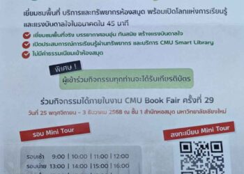 ด้วยสำนักหอสมุด มหาวิทยาลัยเชียงใหม่ กำหนดจัดงานสัปดาห์หนังสือแห่งปี CMU BOOK FAIR ครั้งที่ 29 ระหว่างวันที่ 25 พ.ย.2568 เวลา 09.00 น.-21.00 น. ณ บริเวณโดยรอบอาคารสำนักหอสมุด มหาวิทยาบัยเชียงใหม่ เพื่อส่งเสริมการอ่านแ่กนักเรียนนักศึกษา ประชาชนทั่วไป รายละเอียดตามเอกสารแนบมาพร้อมนี้