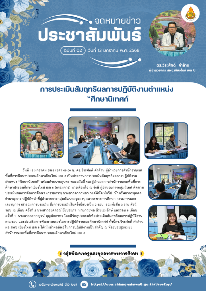 วันที่ 13 มกราคม 2569 เวลา 09.00 น. ดร.วีระศักดิ์ คำล้าน ผู้อำนวยการสำนักงานเขตพื้นที่การศึกษาประถมศึกษาเชียงใหม่ เขต 6 เป็นประธานการประเมินสัมฤทธิผลการปฏิบัติงานตำแหน่ง “ศึกษานิเทศก์” พร้อมด้วยนายสุนทร ทองสวัสดิ์ รองผู้อำนวยการสำนักงานเขตพื้นที่การศึกษาประถมศึกษาเชียงใหม่ เขต 6 (กรรมการ) นางเตือนใจ ณ รังษี ผู้อำนวยการกลุ่มนิเทศ ติดตาม ประเมินผลการจัดการศึกษา (กรรมการ) นางสาวดากานดา วงศ์พิพัฒน์ทวีป นักทรัพยากรบุคคลชำนาญการ ปฏิบัติหน้าที่ผู้อำนวยการกลุ่มพัฒนาครูและบุคลากรทางการศึกษา กรรมการและเลขานุการ เข้าร่วมการประเมิน ซึ่งการประเมินในครั้งนี้แบ่งเป็น 2 รอบ รวมทั้งสิ้น 3 ราย ดังนี้ รอบ 12 เดือน ครั้งที่ 2 นางสาวรชตภรณ์ ชัยประภา นายกฤชพล ธีระเขมรักษ์ และรอบ 6 เดือน ครั้งที่ 1 นางสาวกรกาญจน์ บุญศักดาพร โดยมีวัตถุประสงค์เพื่อประเมินสัมฤทธิผลการปฏิบัติงานตามรอบ และส่งเสริมการพัฒนาตนเองในการปฏิบัติงานของศึกษานิเทศก์ ทั้งนี้ดร.วีระศักดิ์ คำล้าน ผอ.สพป เชียงใหม่ เขต 6 ได้เน้นย้ำผลลัพธ์ในการปฏิบัติงานเป็นสำคัญ ณ ห้องประชุมแม่ยะ สำนักงานเขตพื้นที่การศึกษาประถมศึกษาเชียงใหม่ เขต 6
