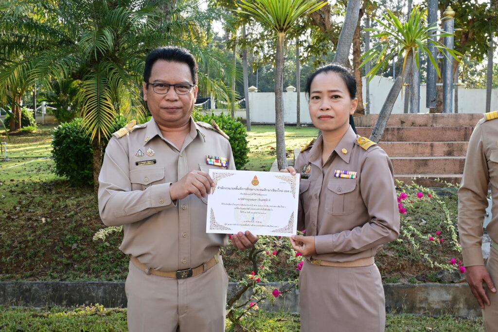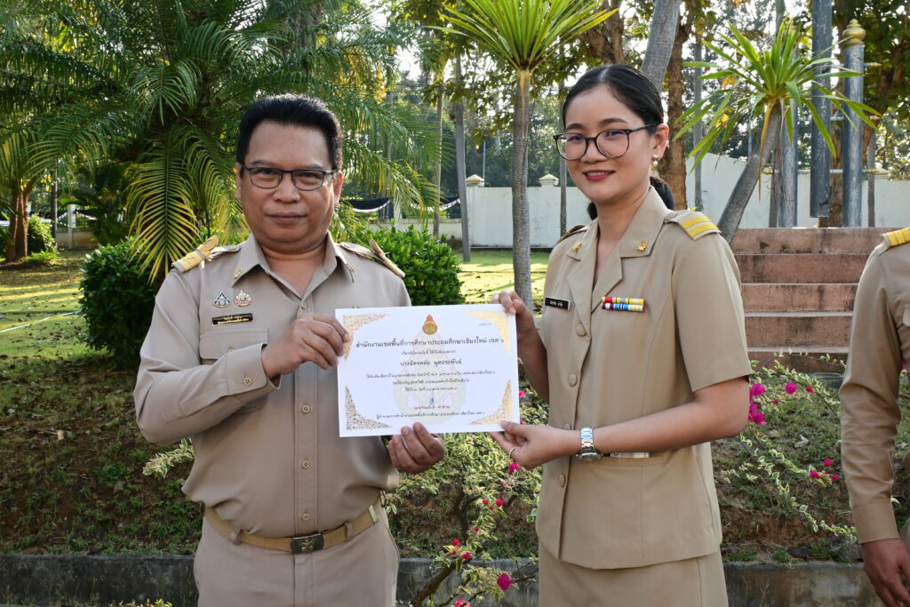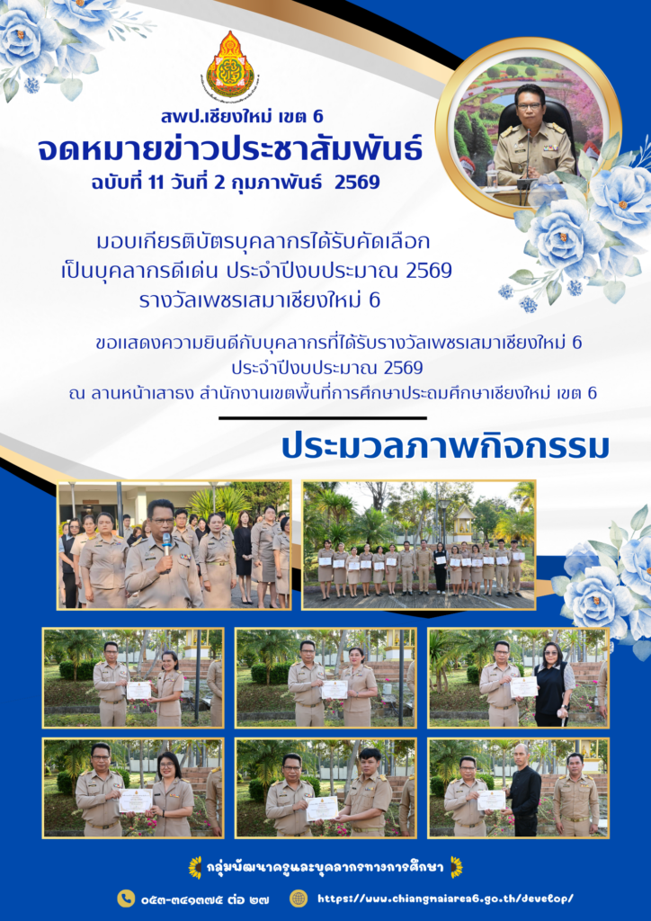 วันที่ 2 กุมภาพันธ์ 2569 เวลา 08.30 น.ดร.วีระศักดิ์ คำล้าน ผู้อำนวยการสำนักงานเขตพื้นที่การศึกษาประถมศึกษาเชียงใหม่ เขต 6 มอบเกียรติบัตรบุคลากรได้รับคัดเลือกเป็นบุคลากรดีเด่น ประจำปีงบประมาณพ.ศ. 2569 รางวัลเพชรเสมาเชียงใหม่ 6 และขอแสดงความยินดีกับบุคลากรที่ได้รับรางวัลบุคลากรได้รับคัดเลือกเป็นบุคลากรดีเด่น ประจำปีงบประมาณพ.ศ. 2569 รางวัลเพชรเสมาเชียงใหม่ 6 ณ ลานหน้าเสาธง สำนักงานเขตพื้นที่การศึกษาประถมศึกษาเชียงใหม่ เขต 6