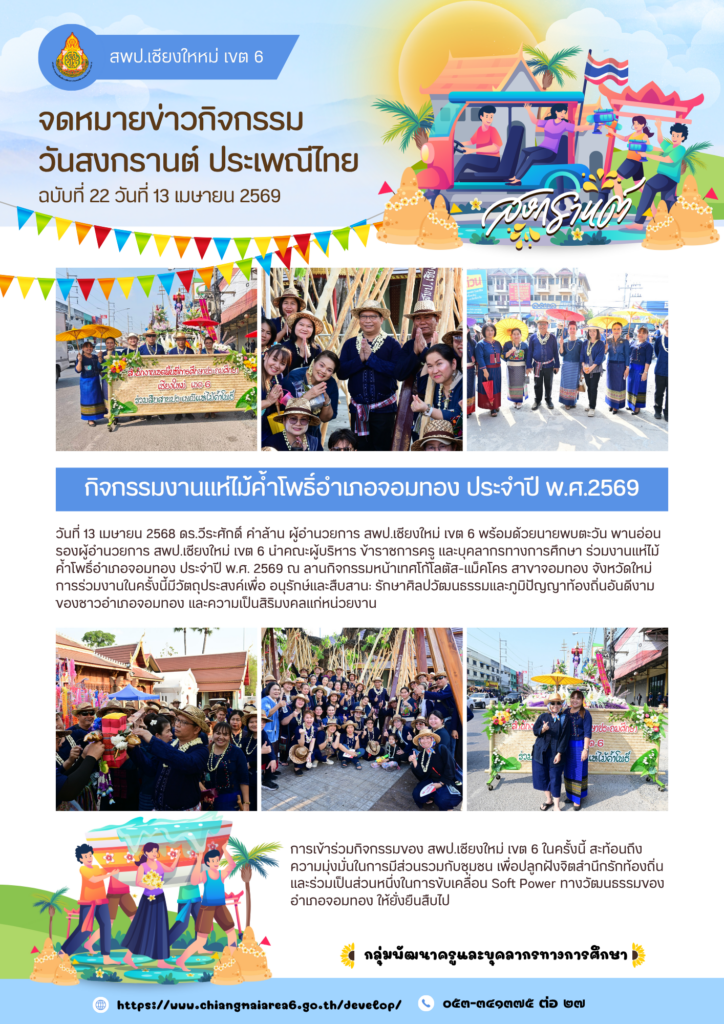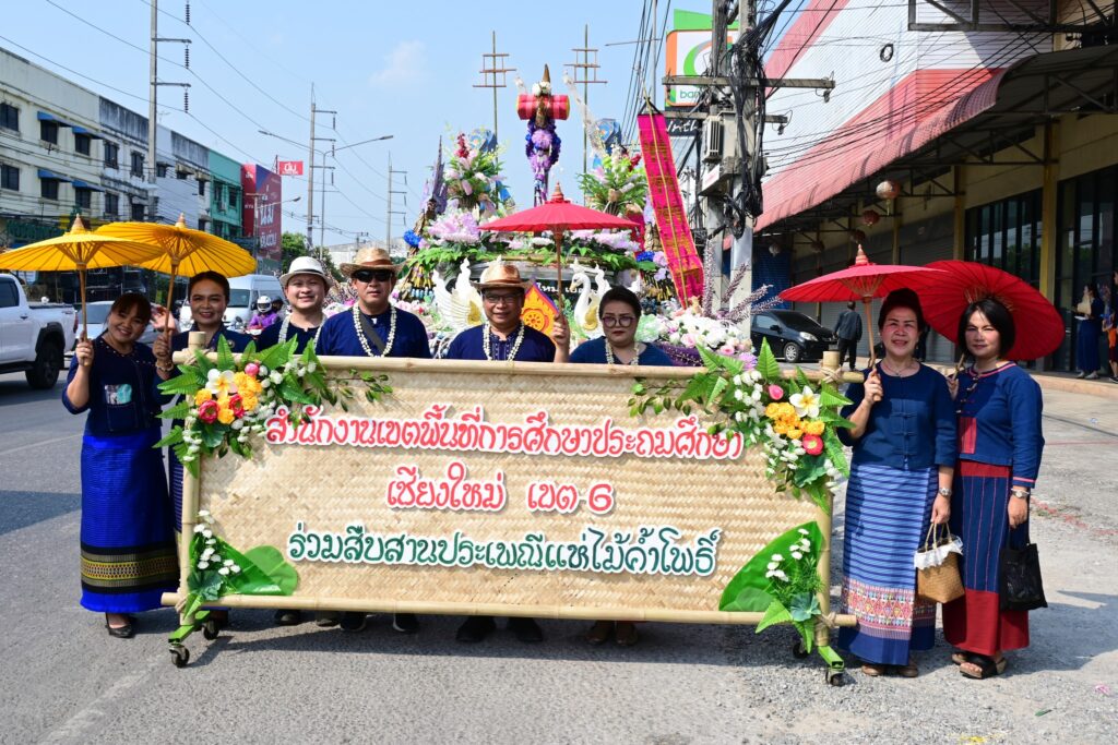 วันที่ 13 เมษายน 2568 ดร.วีระศักดิ์ คำล้าน ผู้อำนวยการ สพป.เชียงใหม่ เขต 6 พร้อมด้วยนายพบตะวัน พานอ่อน รองผู้อำนวยการ สพป.เชียงใหม่ เขต 6 นำคณะผู้บริหาร ข้าราชการครู และบุคลากรทางการศึกษา ร่วมงานแห่ไม้ค้ำโพธิ์อำเภอจอมทอง ประจำปี พ.ศ. 2569 ณ ลานกิจกรรมหน้าเทศโก้โลตัส-แม็คโคร สาขาจอมทอง จังหวัดใหม่ การร่วมงานในครั้งนี้มีวัตถุประสงค์เพื่อ อนุรักษ์และสืบสาน: รักษาศิลปวัฒนธรรมและภูมิปัญญาท้องถิ่นอันดีงามของชาวอำเภอจอมทอง และความเป็นสิริมงคลแก่หน่วยงาน