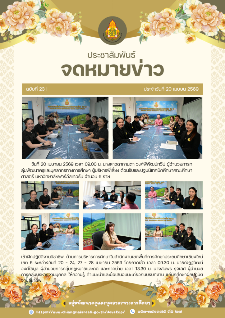 วันที่ 20 เมษายน 2569 เวลา 09.00 น. นางสาวดากานดา วงศ์พิพัฒน์ทวีป ผู้อำนวยการกลุ่มพัฒนาครูและบุคลากรทางการศึกษา ผู้บริหารพี่เลี้ยง ต้อนรับและปฐมนิเทศนักศึกษาคณะศึกษาศาสตร์ มหาวิทยาลัยฟาร์อีสเทอร์น จำนวน 6 ราย เข้าฝึกปฏิบัติงานวิชาชีพ ด้านการบริหารการศึกษาในสำนักงานเขตพื้นที่การศึกษาประถมศึกษาเชียงใหม่ เขต 6 ระหว่างวันที่ 20 – 24, 27 – 28 เมษายน 2569 โดยภาคเช้า เวลา 09.30 น. นายณัฏฐวัฒน์ วงศ์ใยมูล ผู้อำนวยการกลุ่มกฎหมายและคดี และภาคบ่าย เวลา 13.30 น. นางสมพร รุจิเลิศ ผู้อำนวยการกลุ่มบริหารงานบุคคล ให้ความรู้ คำแนะนำและข้อเสนอแนะเกี่ยวกับบริบทงาน แก่นักศึกษาฝึกปฏิบัติงานวิชาชีพ
