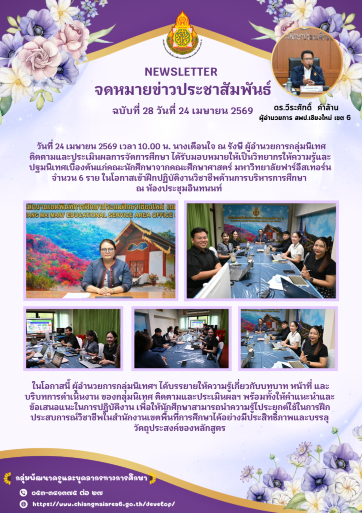 วันที่ 24 เมษายน 2569 เวลา 10.00 น. นางเตือนใจ ณ รังษี ผู้อำนวยการกลุ่มนิเทศ ติดตามและประเมินผลการจัดการศึกษา ได้รับมอบหมายให้เป็นวิทยากรให้ความรู้และปฐมนิเทศเบื้องต้นแก่คณะนักศึกษาจากคณะศึกษาศาสตร์ มหาวิทยาลัยฟาร์อีสเทอร์น จำนวน 6 ราย ในโอกาสเข้าฝึกปฏิบัติงานวิชาชีพด้านการบริหารการศึกษา