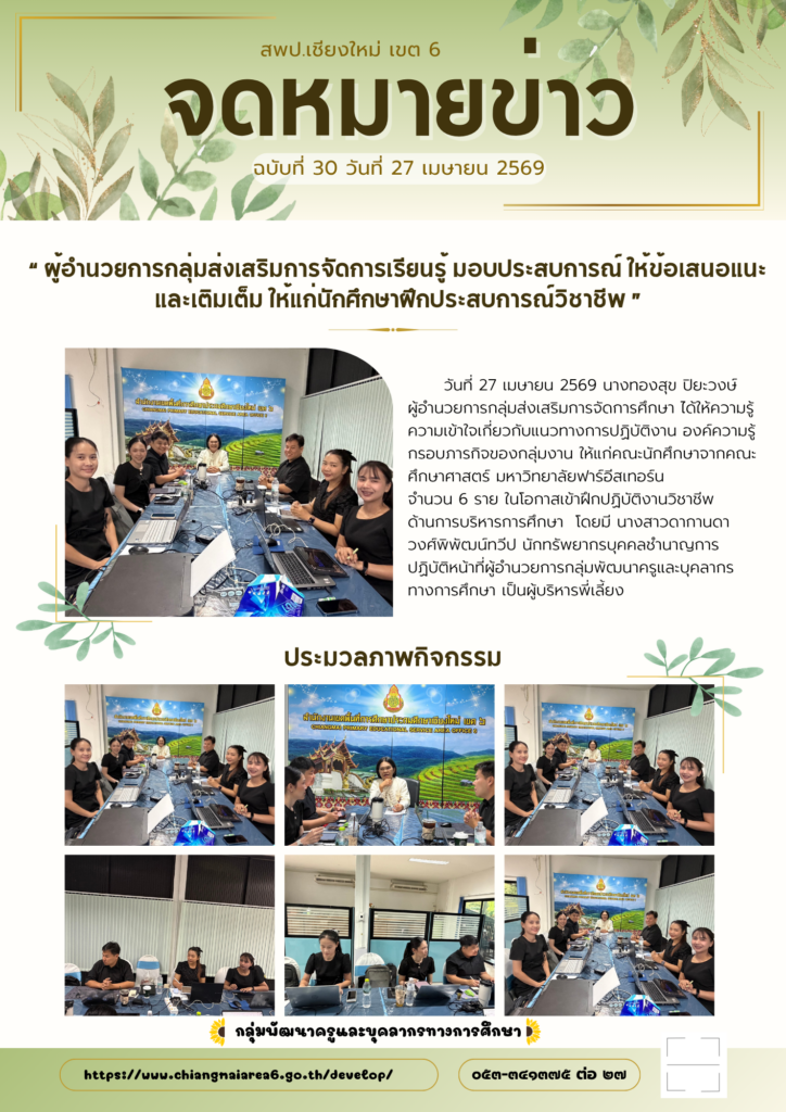 วันที่ 27 เมษายน 2569 นางทองสุข ปิยะวงษ์ ผู้อำนวยการกลุ่มส่งเสริมการจัดการศึกษา ได้ให้ความรู้ ความเข้าใจเกี่ยวกับแนวทางการปฏิบัติงาน องค์ความรู้ กรอบภารกิจของกลุ่มงาน ให้แก่คณะนักศึกษาจากคณะศึกษาศาสตร์ มหาวิทยาลัยฟาร์อีสเทอร์น จำนวน 6 ราย ในโอกาสเข้าฝึกปฏิบัติงานวิชาชีพ ด้านการบริหารการศึกษา โดยมี นางสาวดากานดา วงศ์พิพัฒน์ทวีป นักทรัพยากรบุคคลชำนาญการ ปฏิบัติหน้าที่ผู้อำนวยการกลุ่มพัฒนาครูและบุคลากรทางการศึกษา เป็นผู้บริหารพี่เลี้ยง